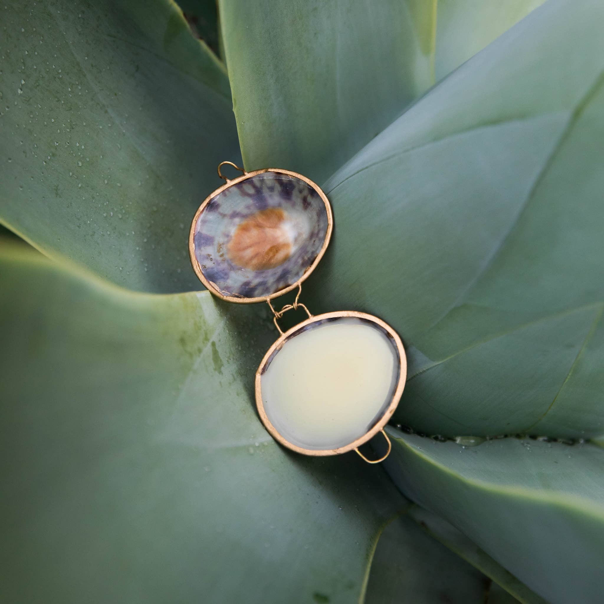 A satin botanical infused lip balm. Helps fight signs of aging while coating lips in nourishing moisture. Eucalyptus, ylang ylang and spearmint are a fresh and bright pairing. Leaves your lips with a glossy, glowy finish. Just as good as old fashioned chapstick, but in a beautiful natural Limpet shell. Hand poured by us.