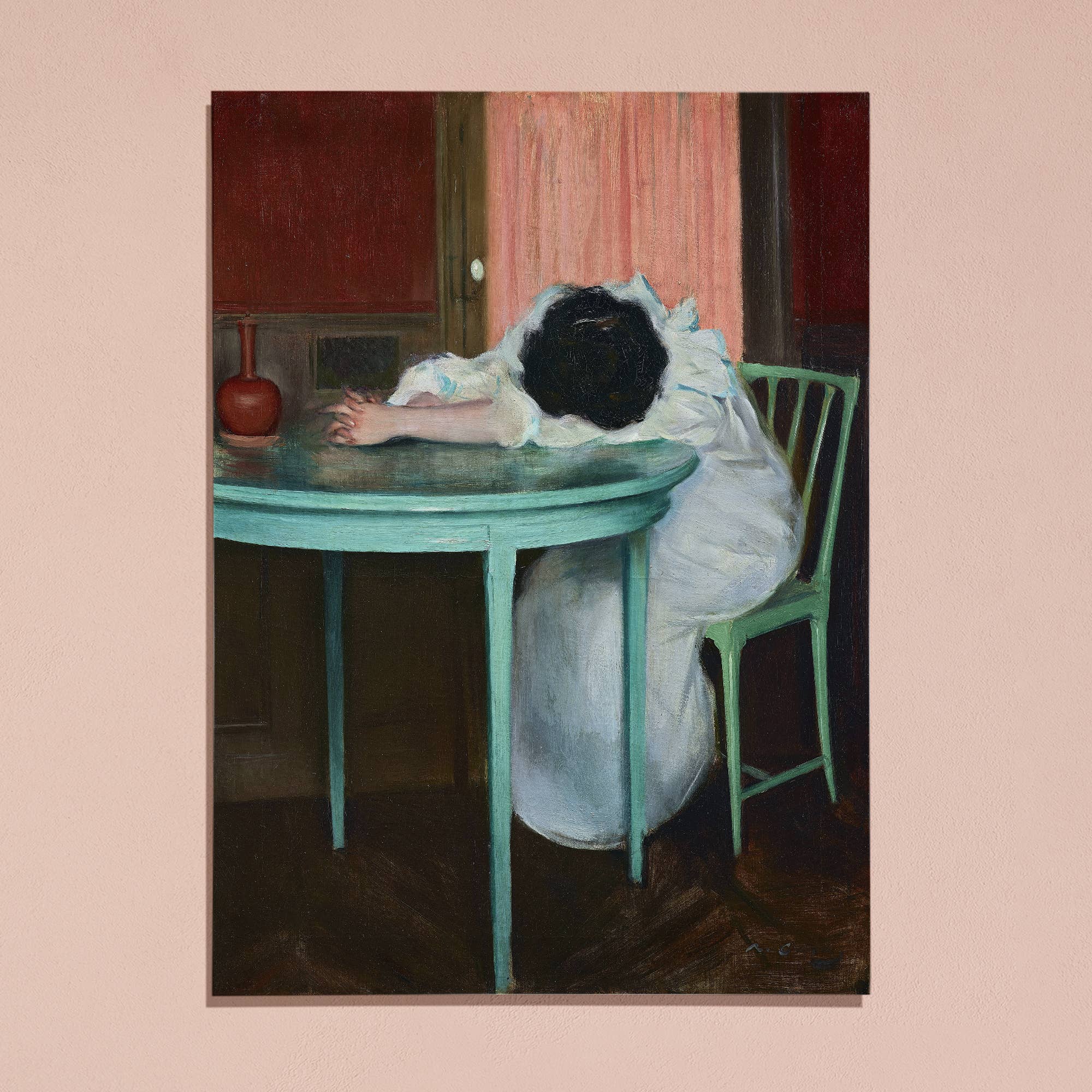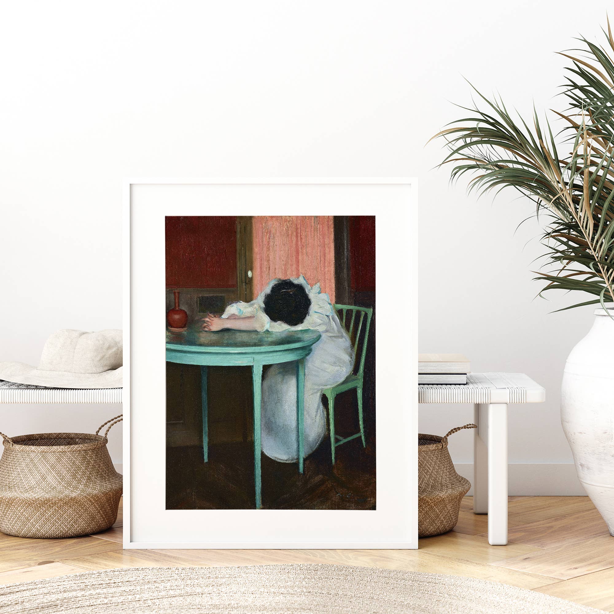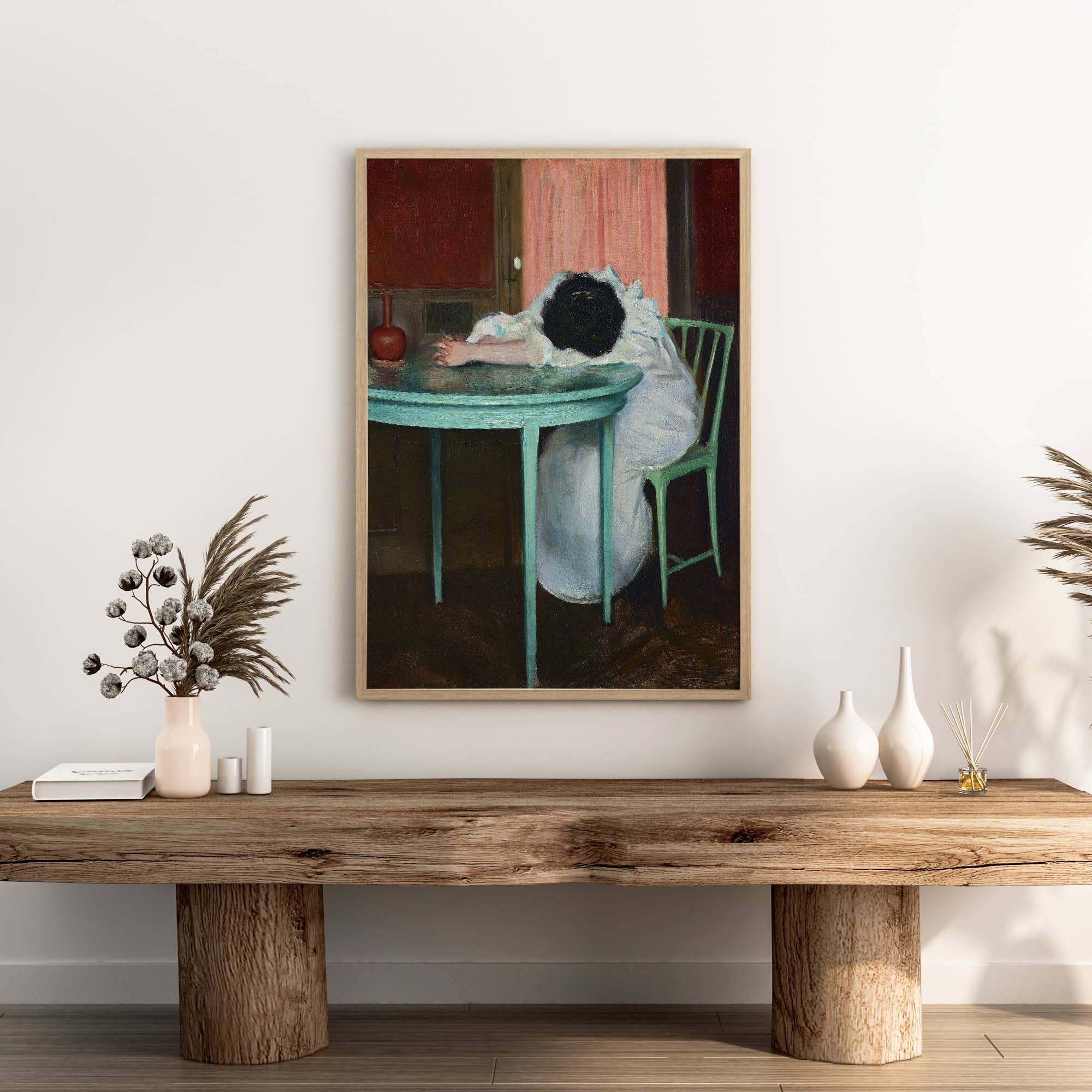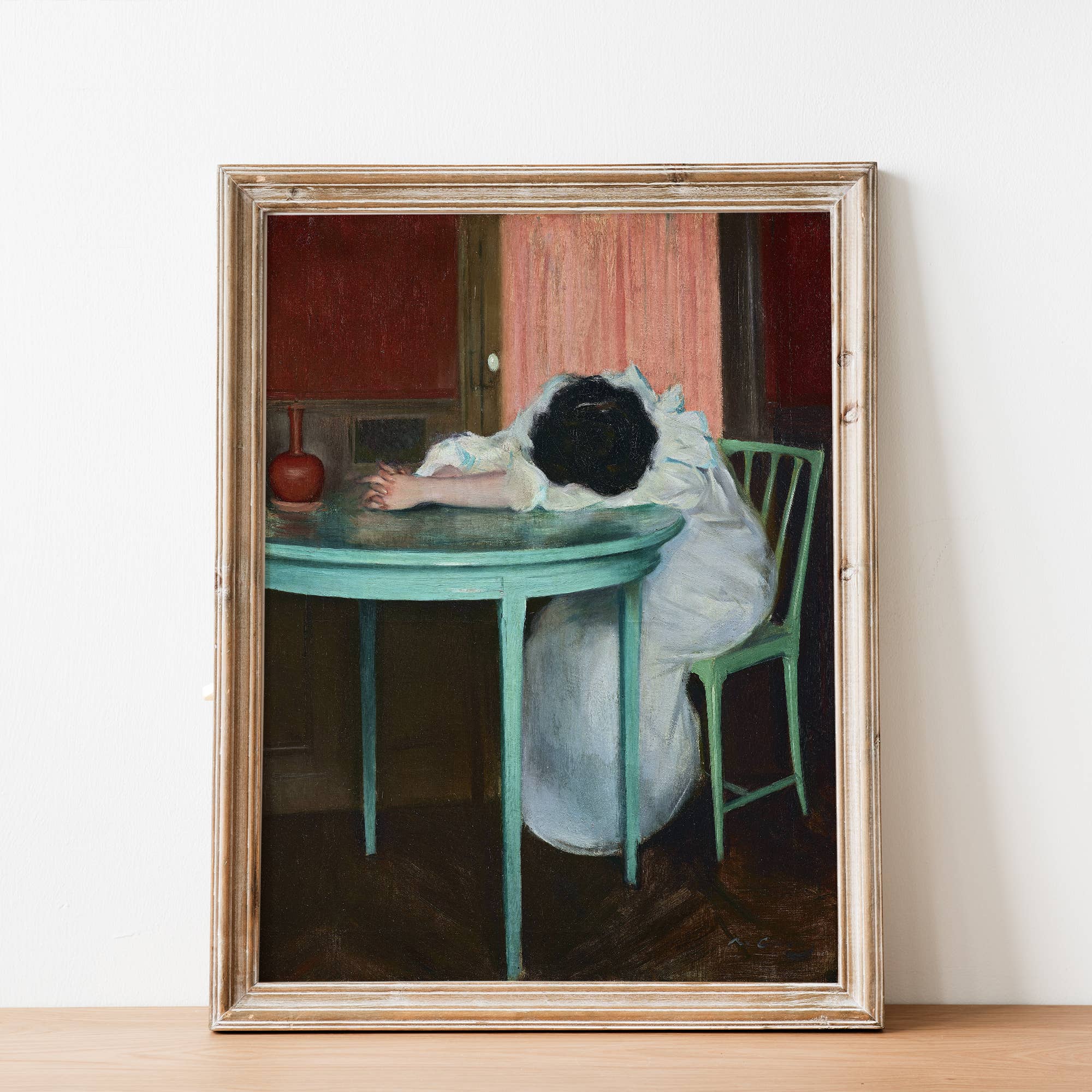 Tired Ramon Casas Oil Painting Wall Art Print, Vintage European French Rustic Sleeping Woman Girl Portrait Poster Moody Farmhouse