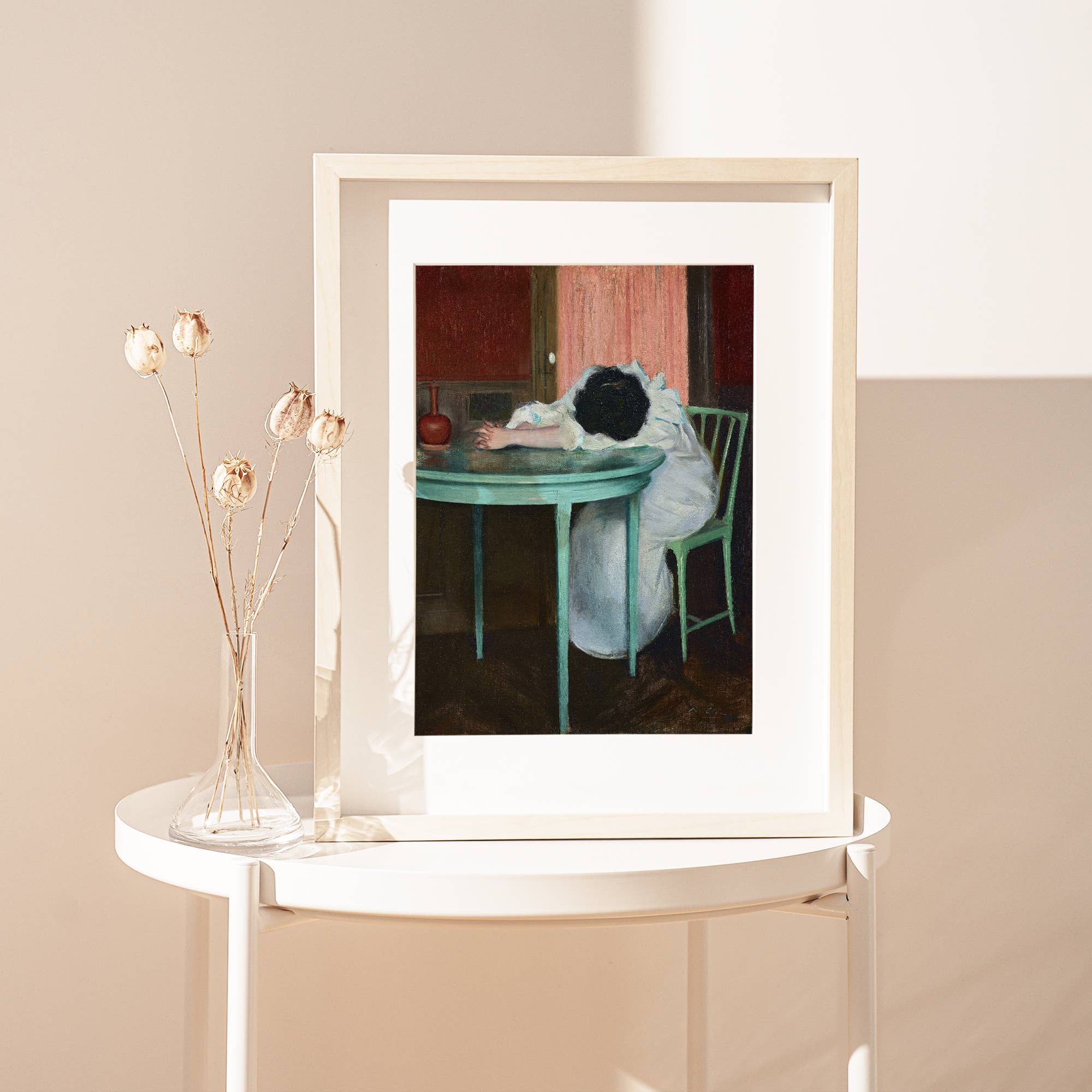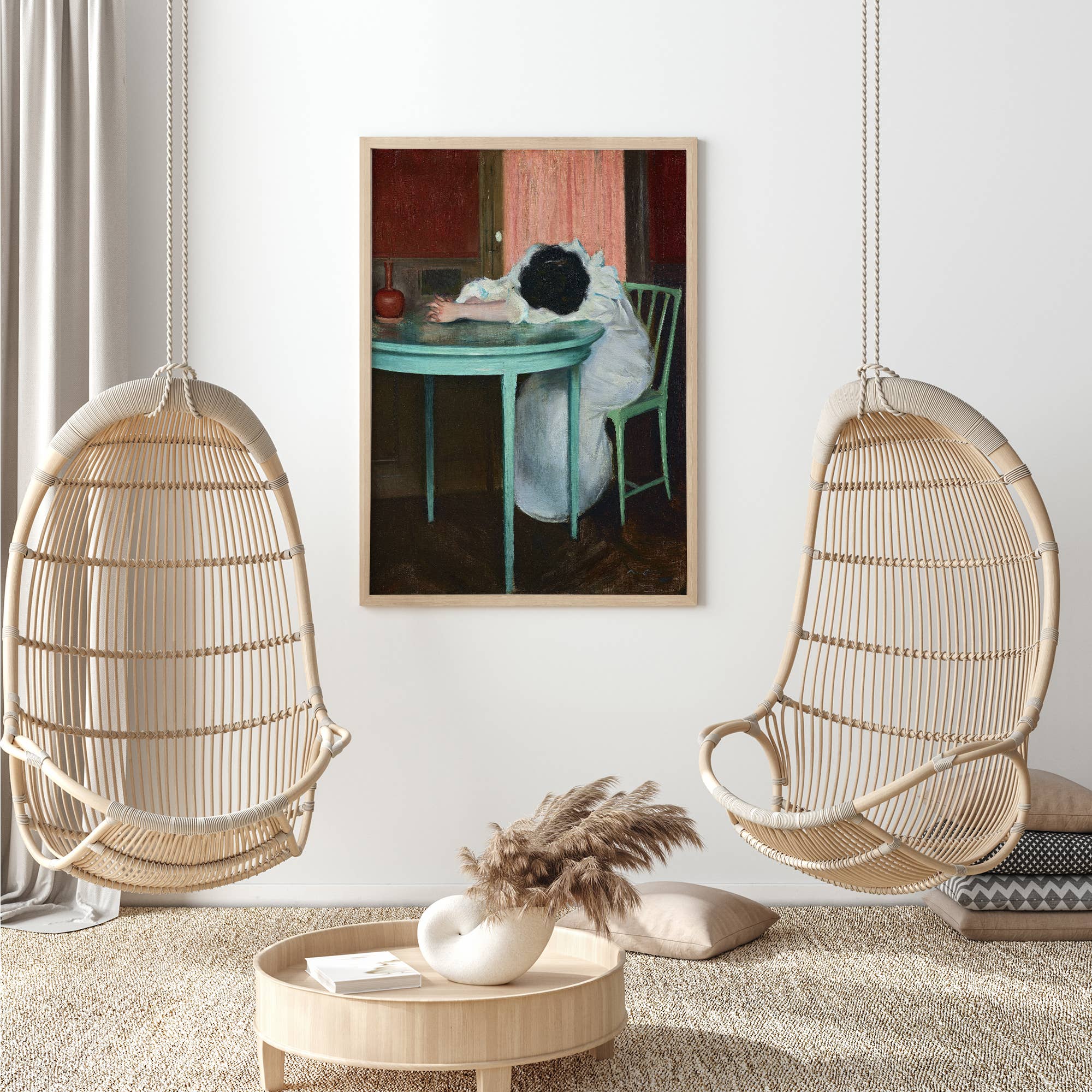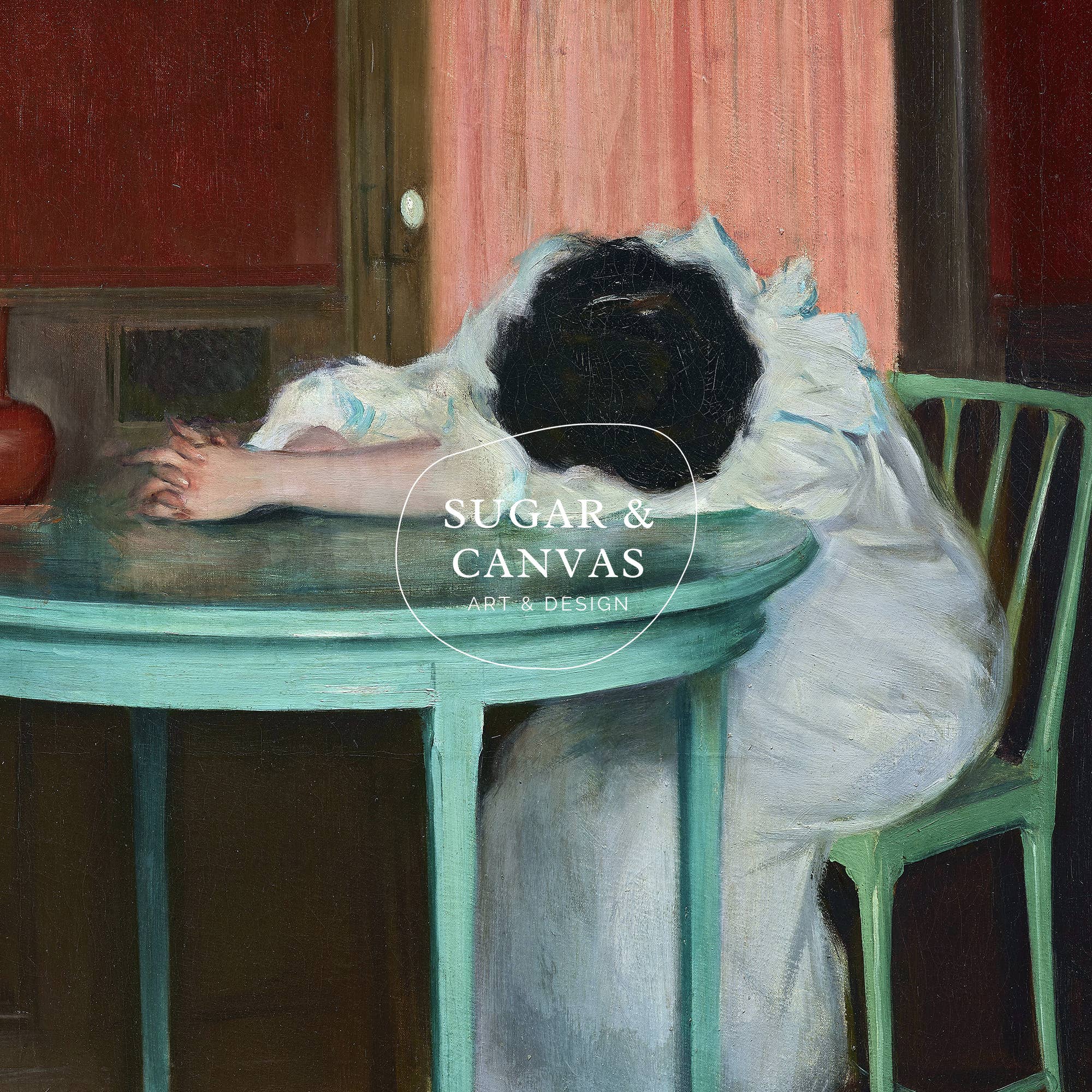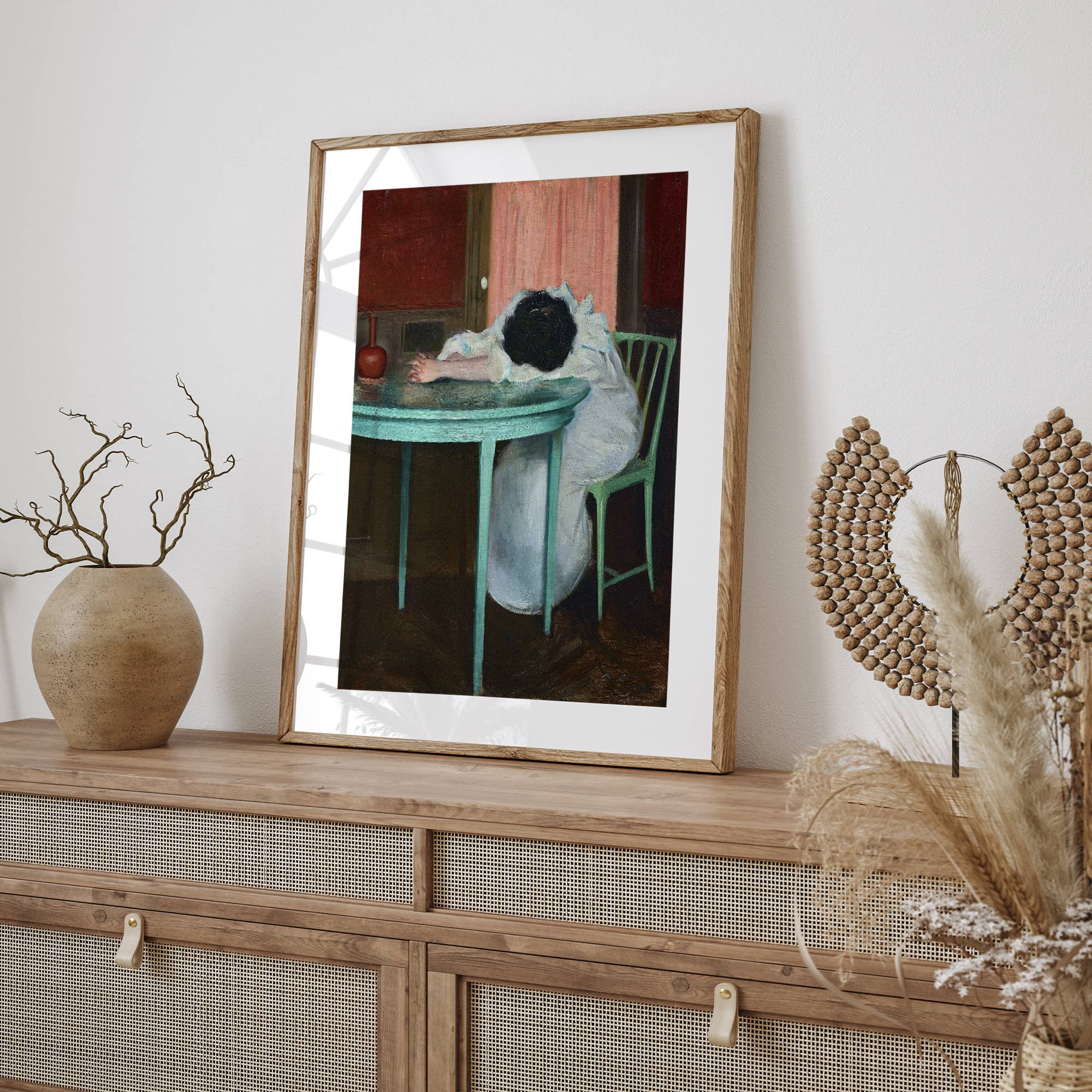 Tired Ramon Casas Oil Painting Wall Art Print, Vintage European French Rustic Sleeping Woman Girl Portrait Poster Moody Farmhouse