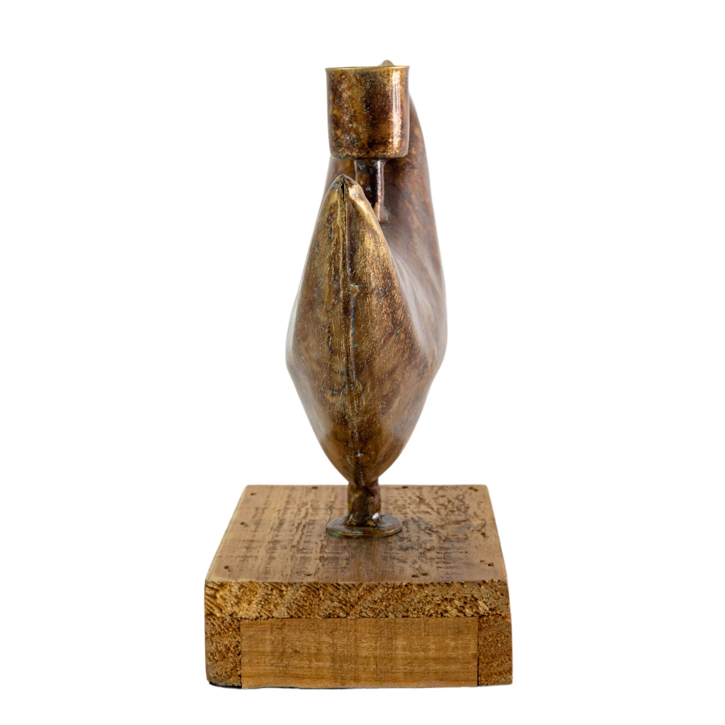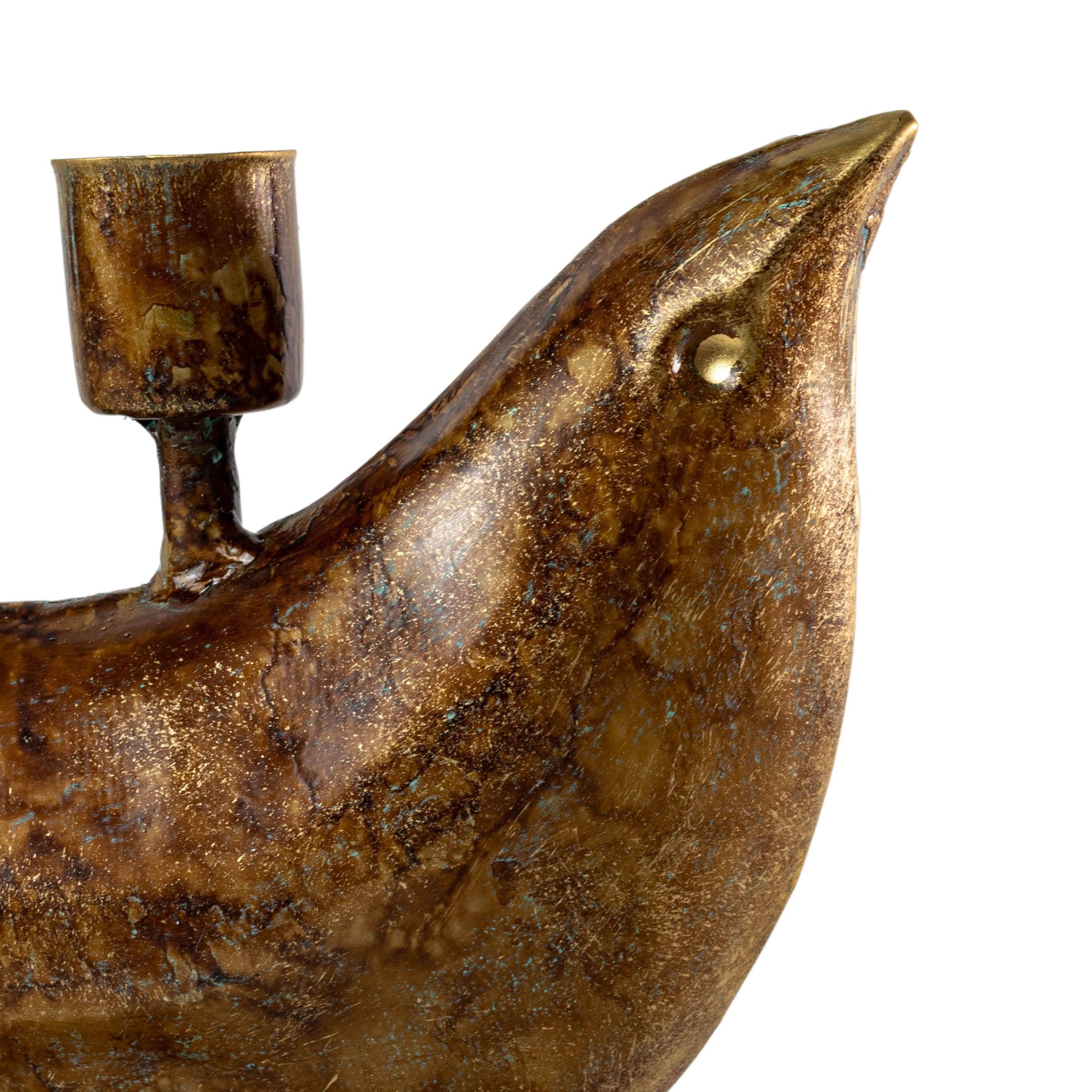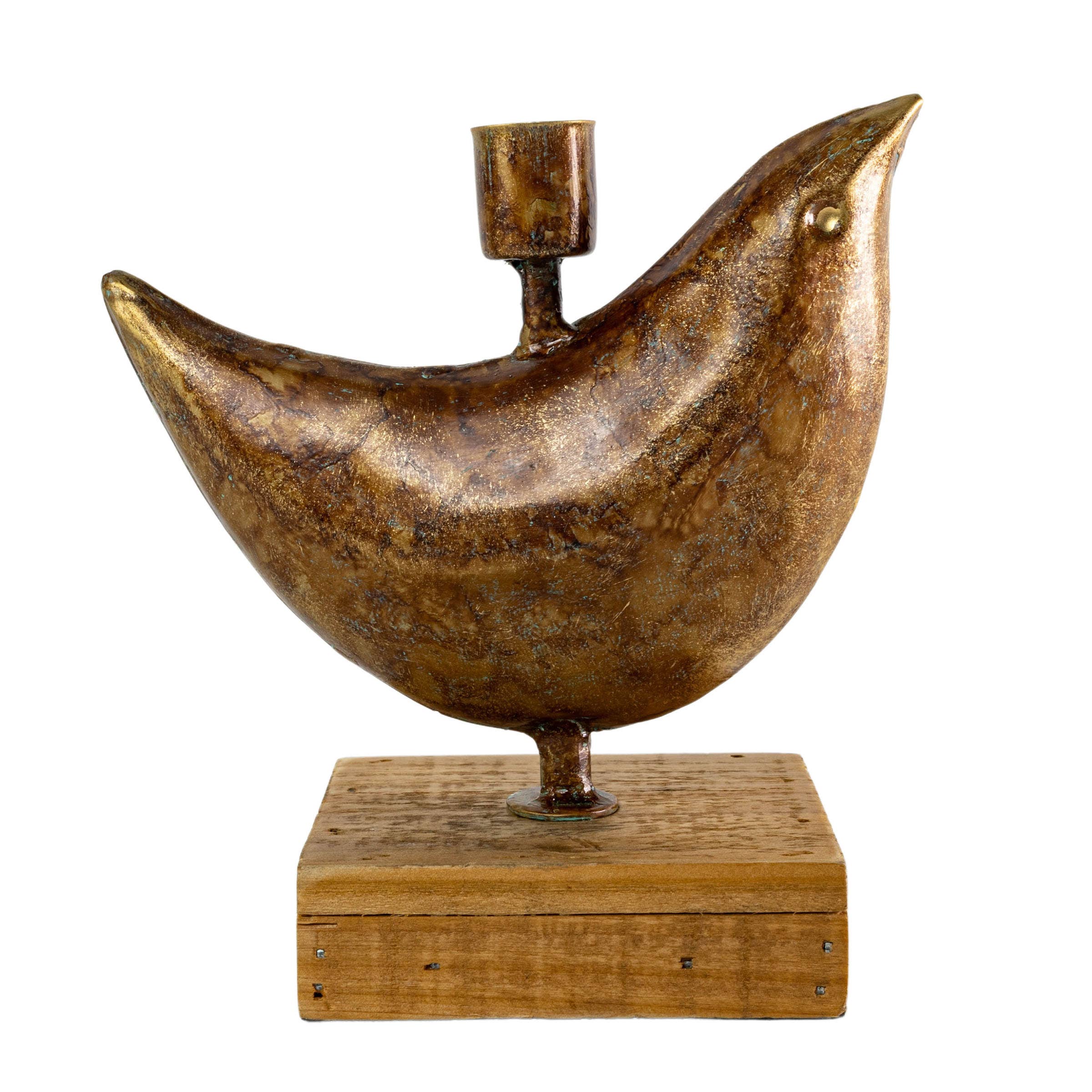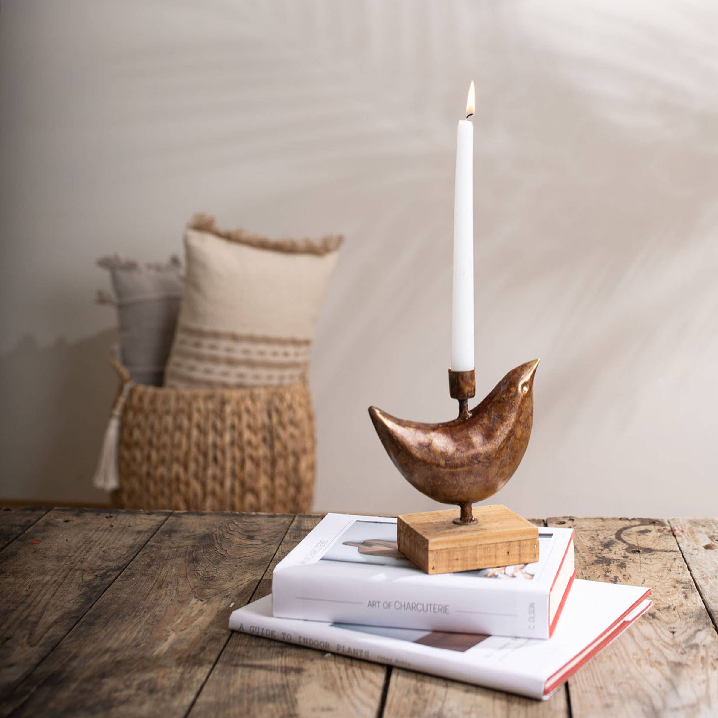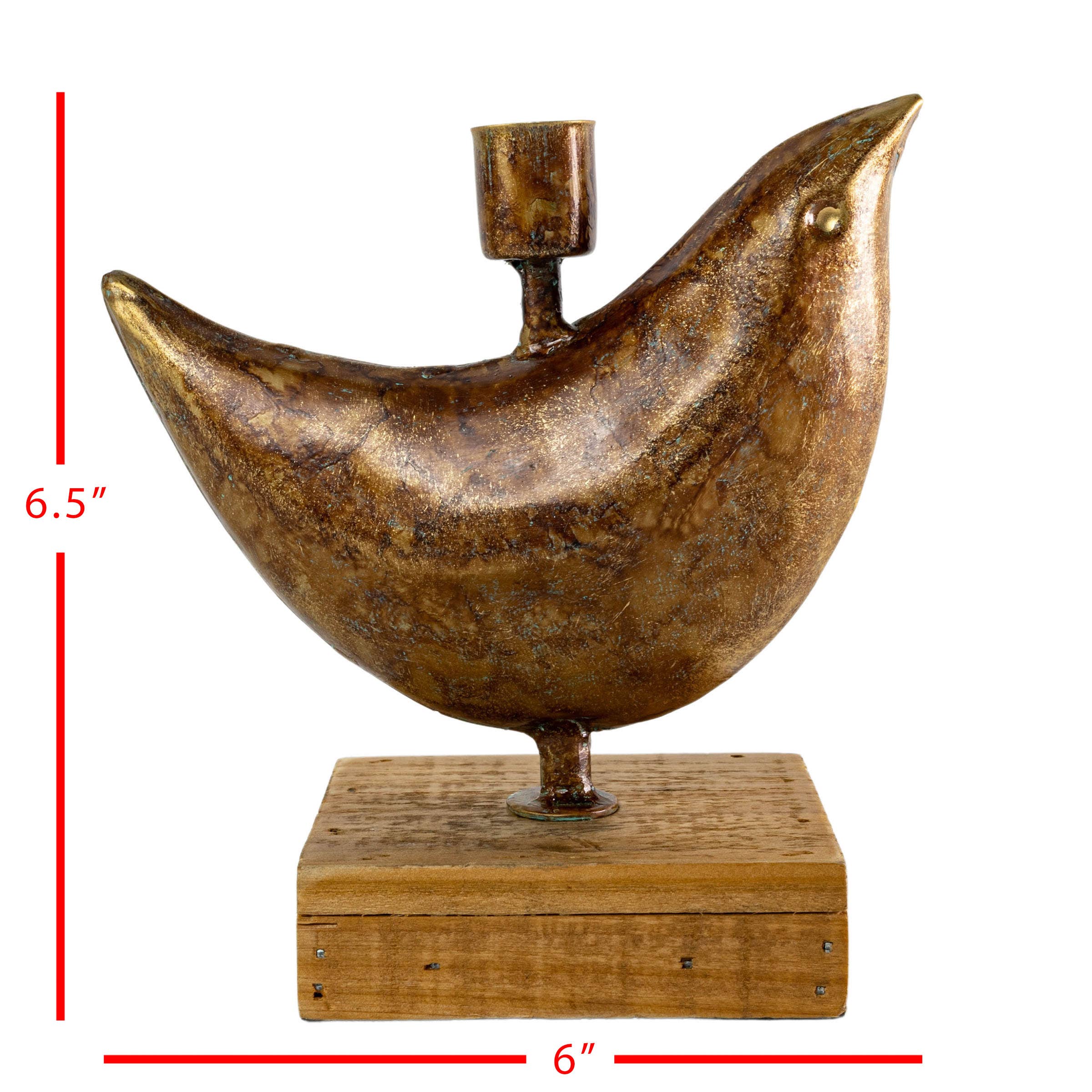 This gorgeous bird taper candle holder is characterized by an acid wash patina finish. Perched atop a wood stand, the modernized bird figure is three-dimensional to sturdily hold a single taper candle. Just the right size to adorn the center of your dining table or mantel. The warm tones of the antiqued brass finish make this the perfect modern accent to warm up your space.