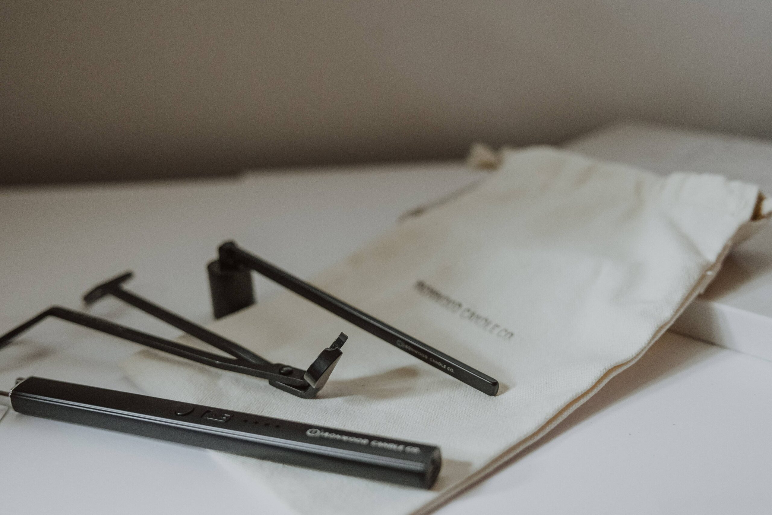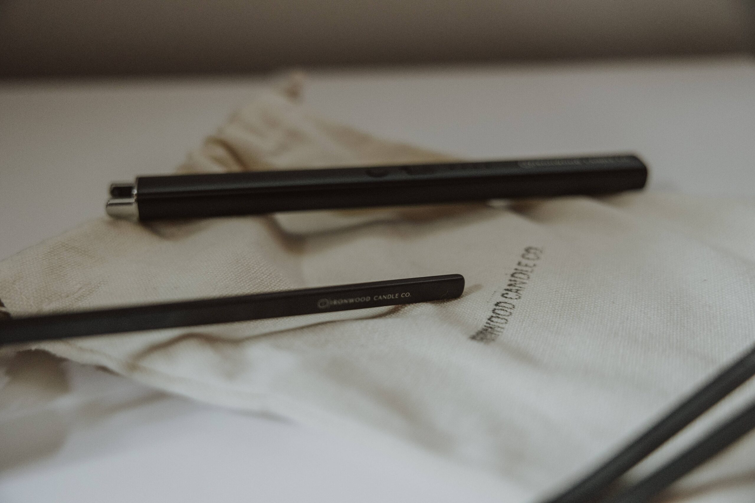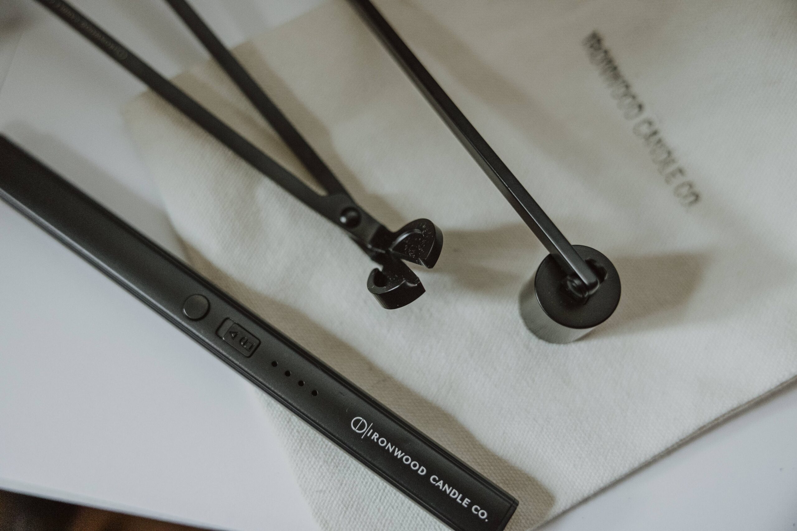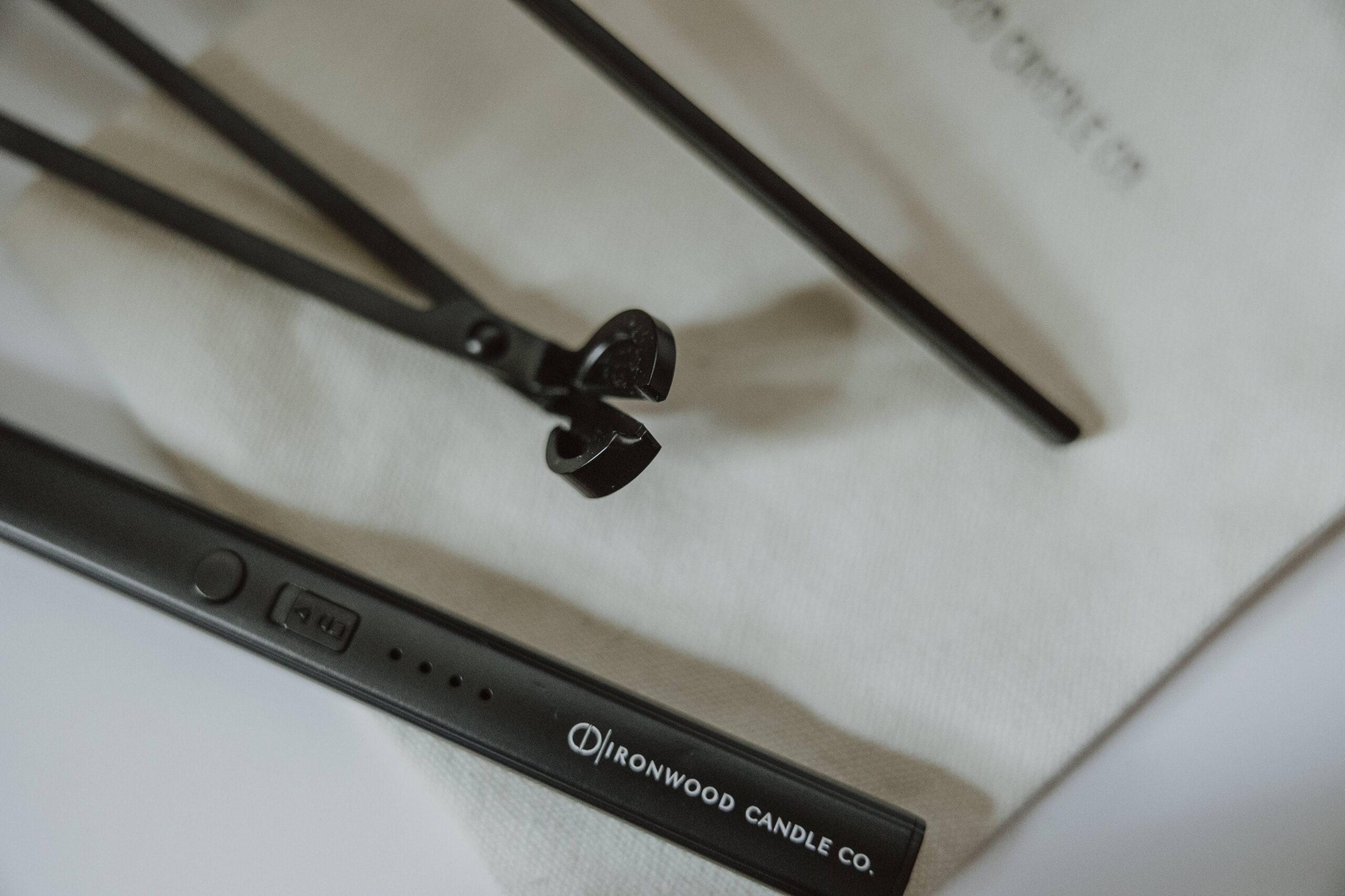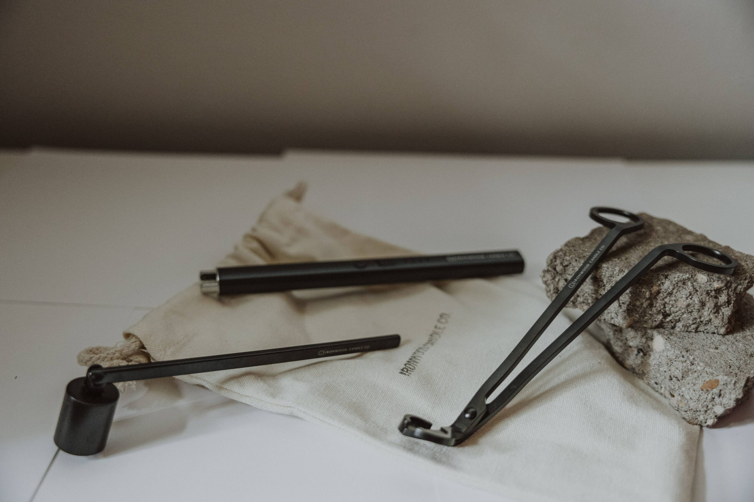 Our matte black stainless steel trio includes a Wick Trimmer, Wick Snuffer, & Rechargeable Lighter (incl charging cord) and comes in our heavy duty canvas bag. Each high quality piece is engraved with our signature logo.