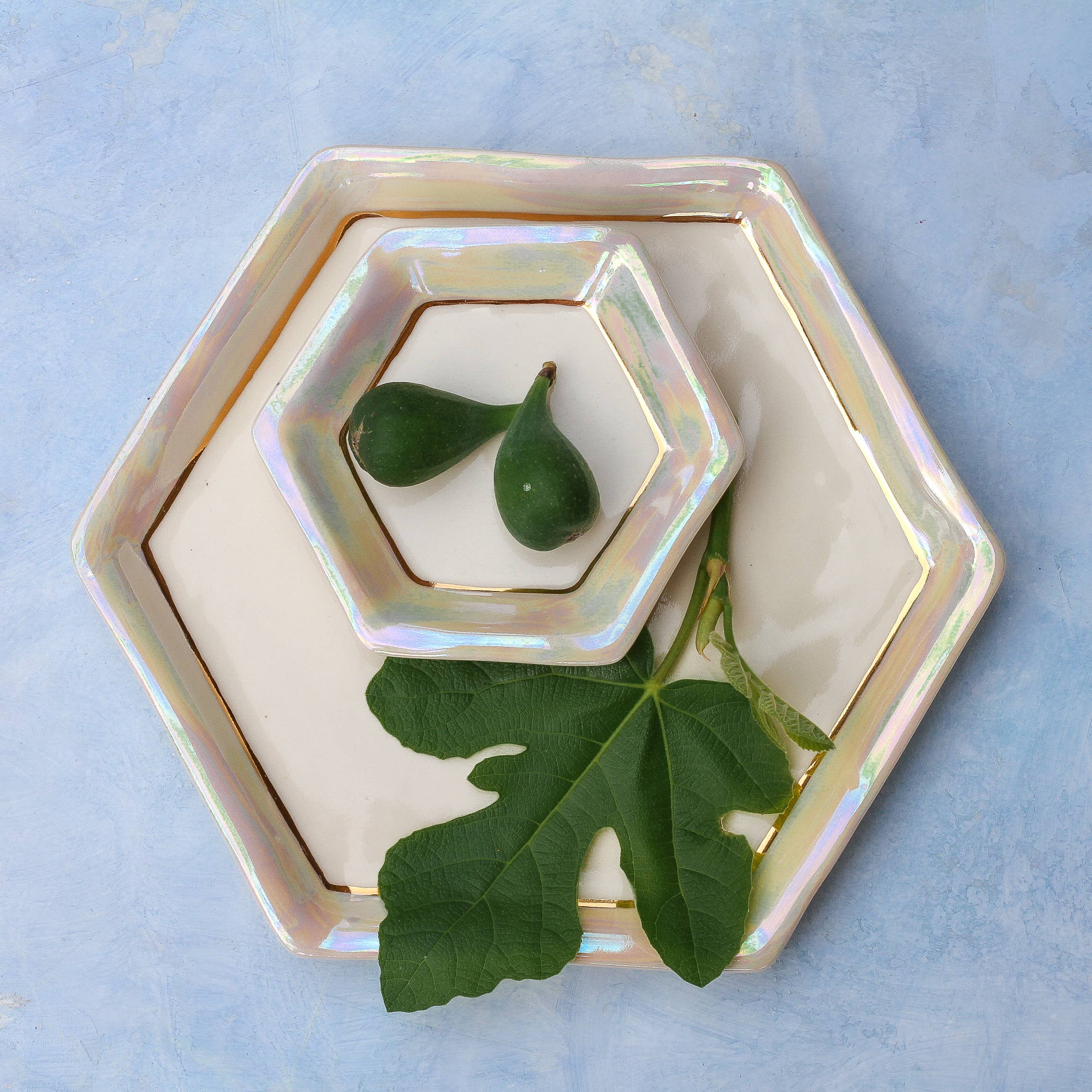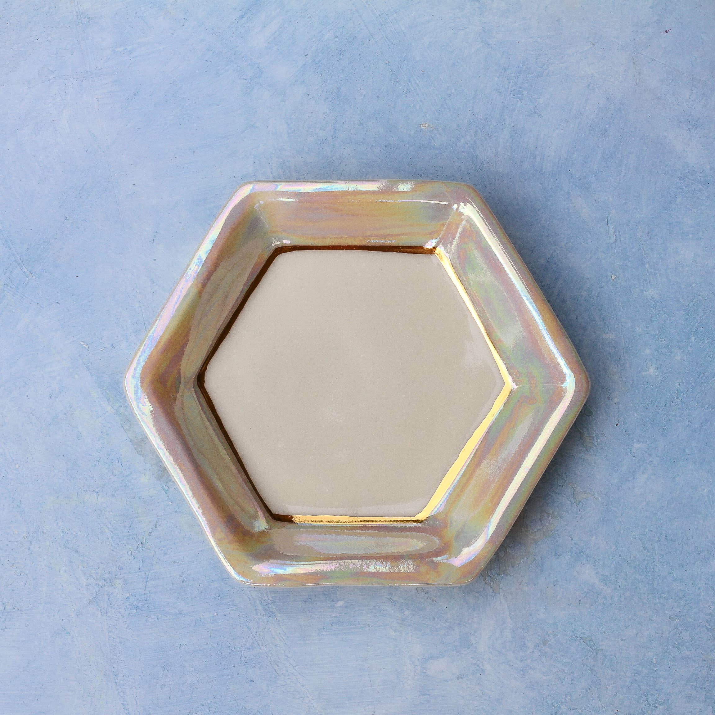 Discover the perfect spot for your treasures with this charming hexagon opal and gold porcelain tray!