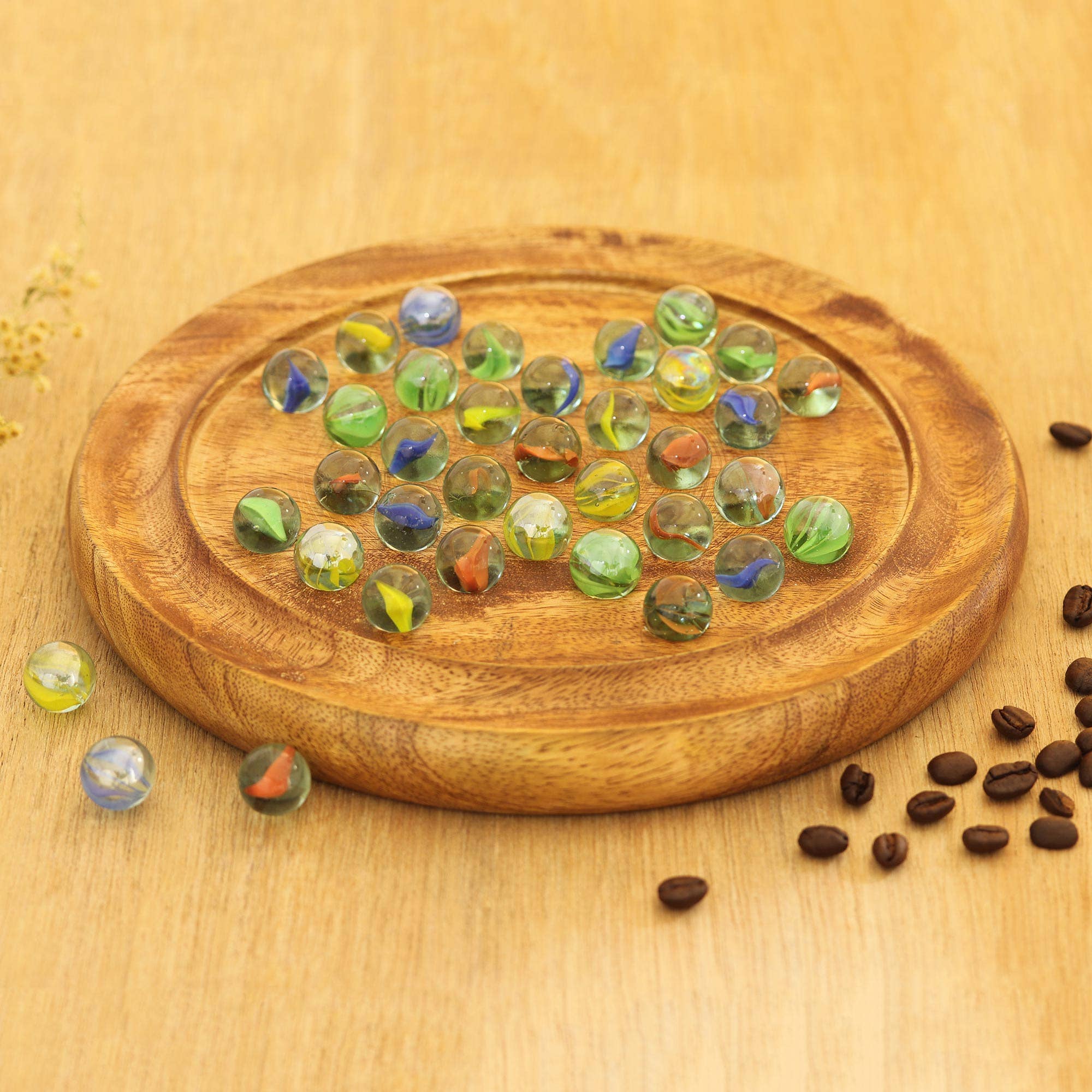 Test your patience in this engaging solitaire marble jumping game designed by Indian artisan Rakesh Pathak. The object of this game is to remove all the marbles except one, preferably in the center of the board. The circular board is carved out of mango wood and comes with 36 multicolored marbles, which are stored in an included tissue pouch.