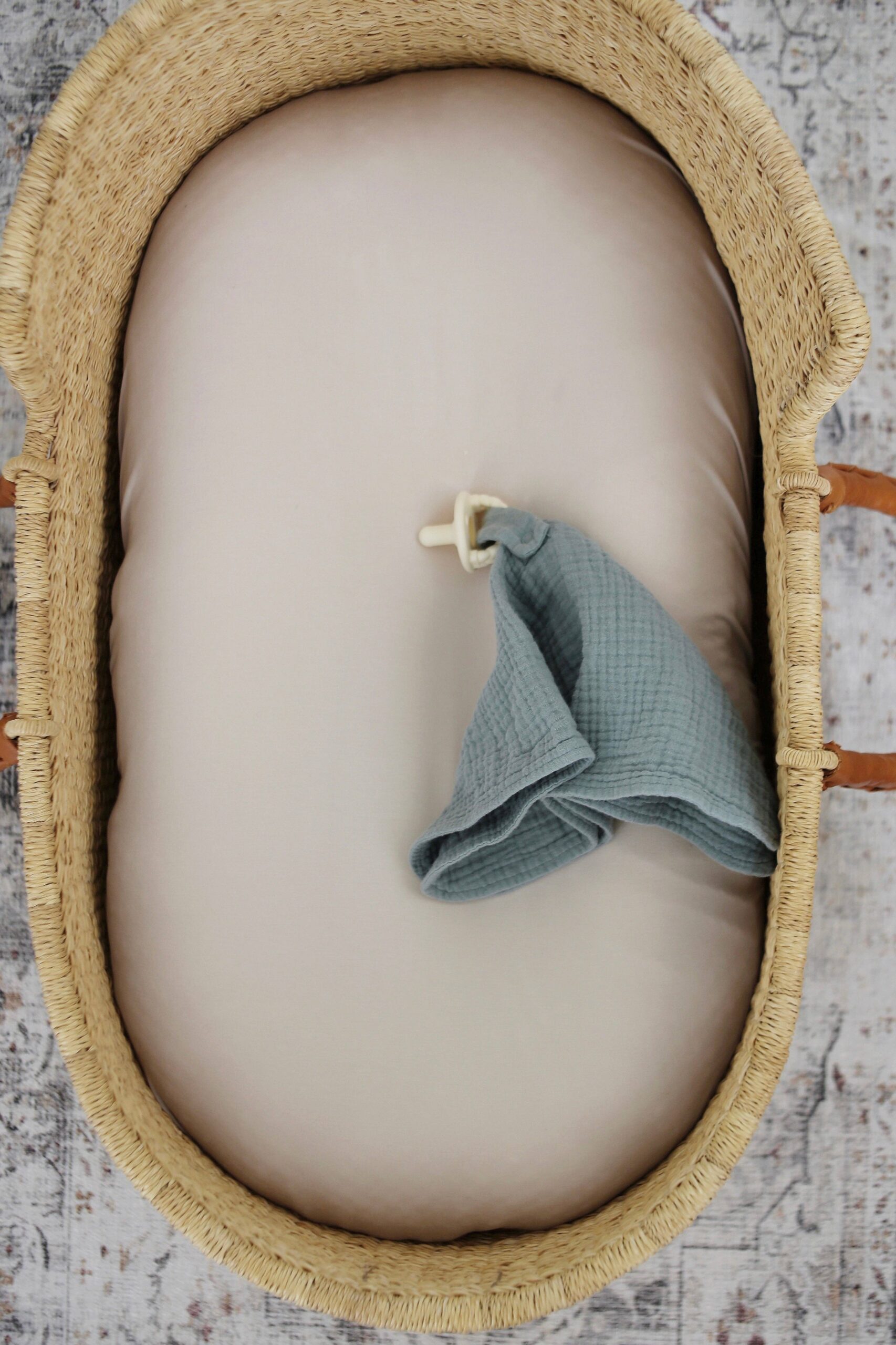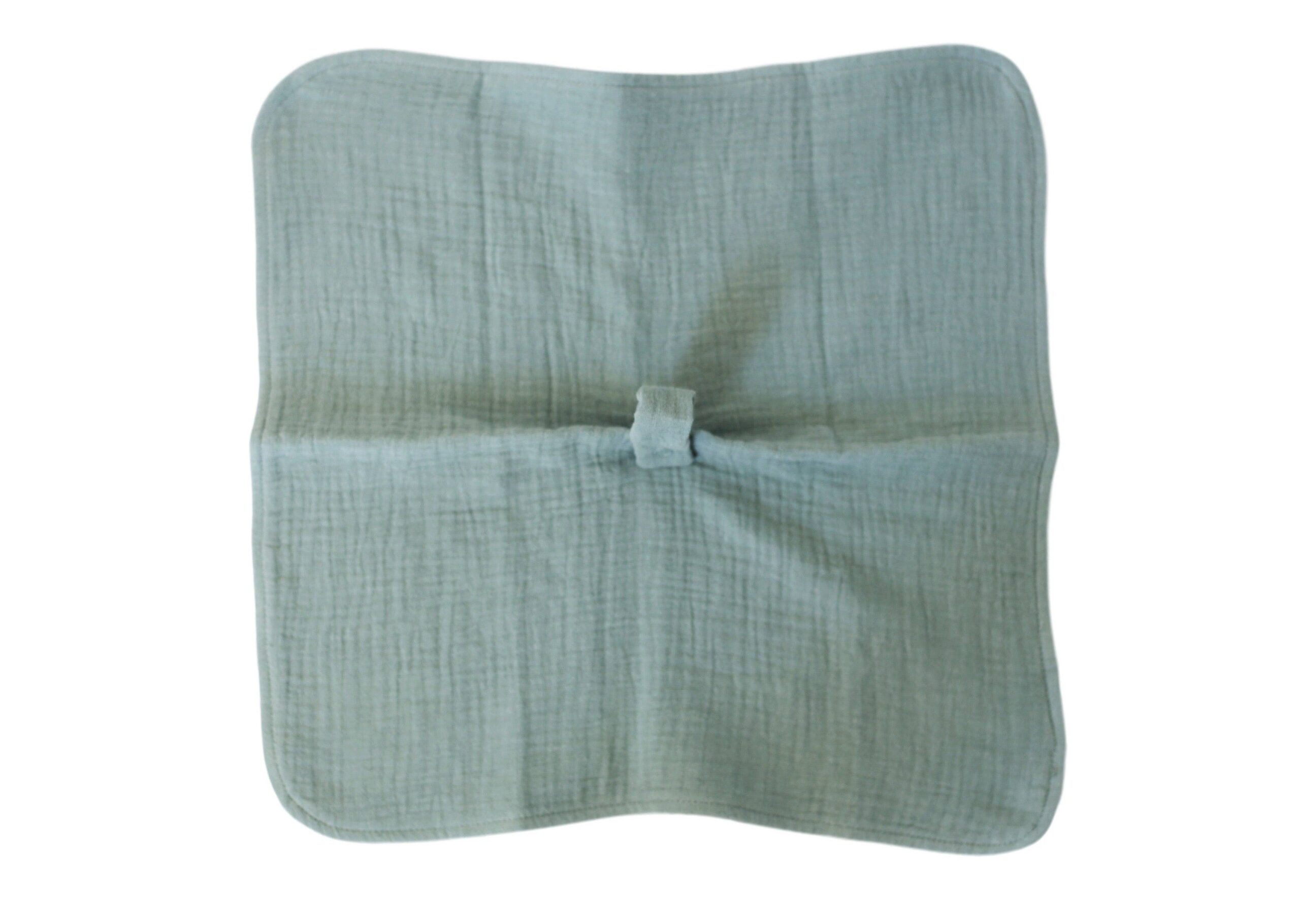 Our sage lovey blanket with snap closure (Pacifier and Teether not Included) is made from a double layer of 100% soft organic cotton muslin that is soft and lightweight, perfect for all seasons and will not irritate sensitive skin.