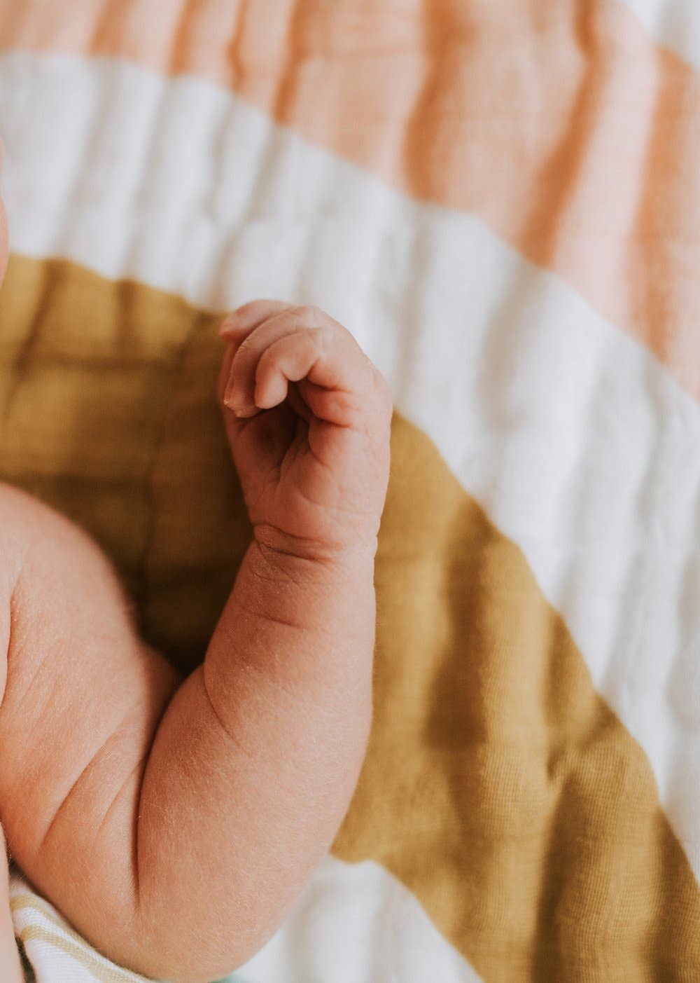 Four layers of muslin come together in a breathable but warm quilt perfect for babies, toddlers, cribs, play time, picnics, and pictures.