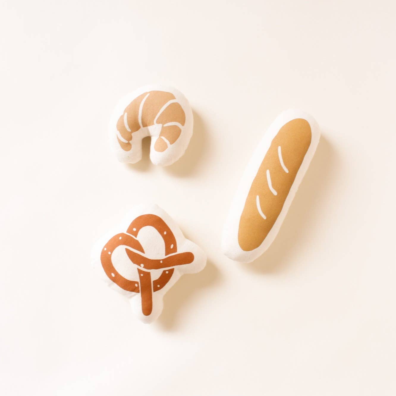 Our bread pillow set comes with three plush mini pillows: a pretzel, a croissant, and a baguette.