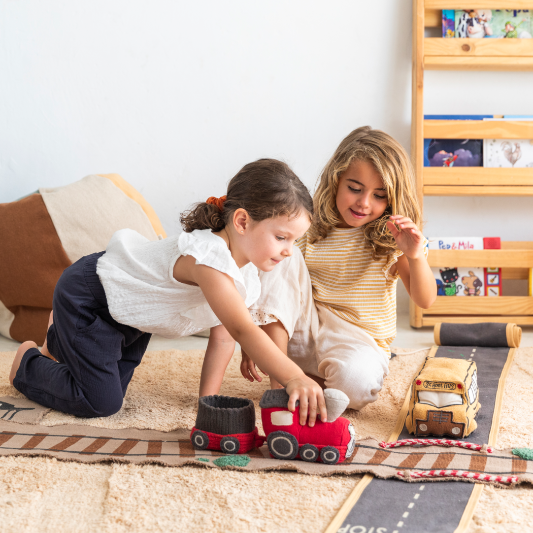 The Ride&Roll Train consists of a soft toy train made in red cotton canvas, with windows as patches and embroidered details and dark grey braided cotton cords as roof and wagon. The train comes rolled up in a 4 mtr long canvas road in Linen color, with printed train tracks, level crossing barriers in red and white, and a train station.