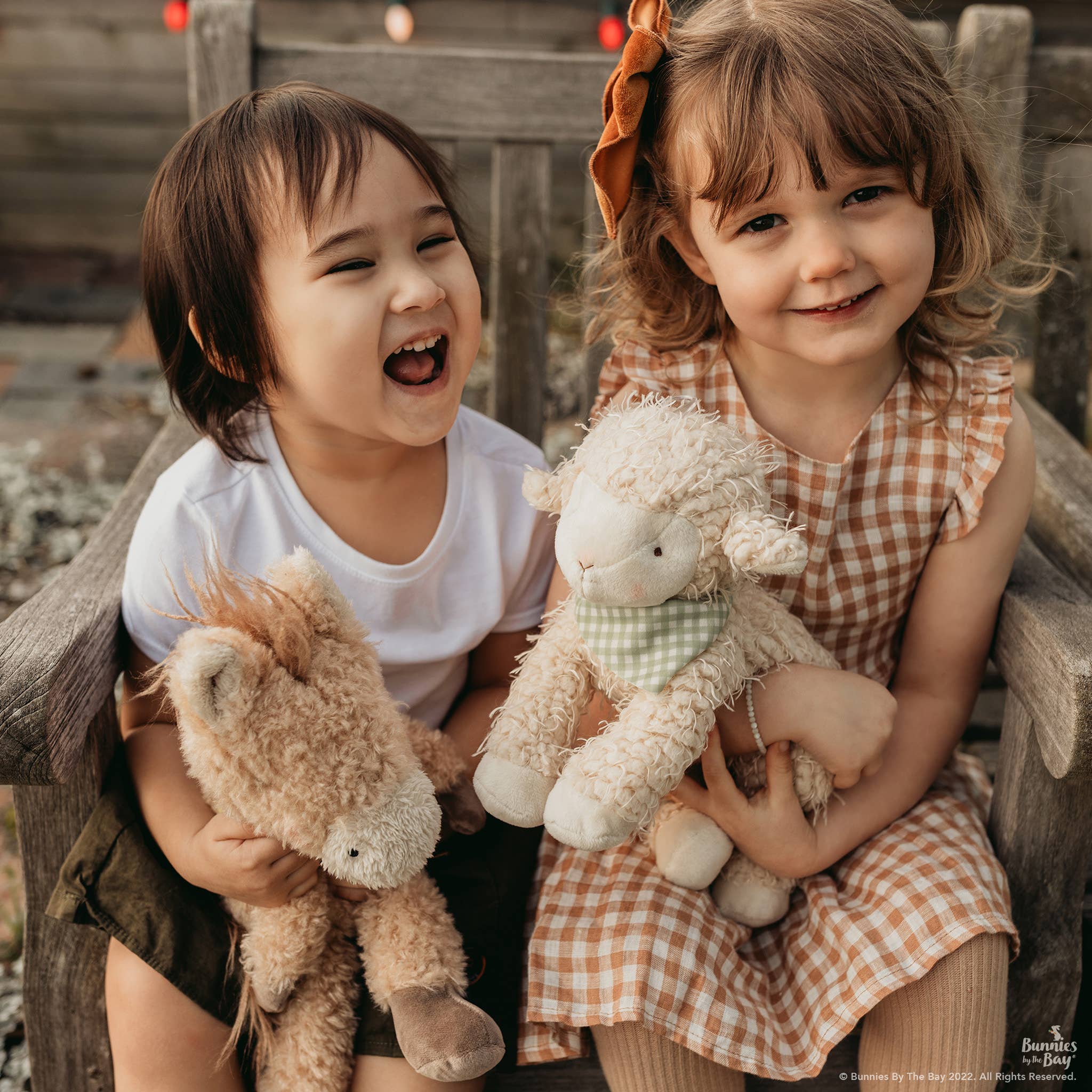 Pony Boy is ready to ride with some lucky little buckaroo. This stuffed animal has tumbly wispy buckskin brown fur body with a cream muzzle and cocoa brown fur mane and tail. Bandana scarf about his neck in colorful curry with cream dots. Saddle up for some fun.