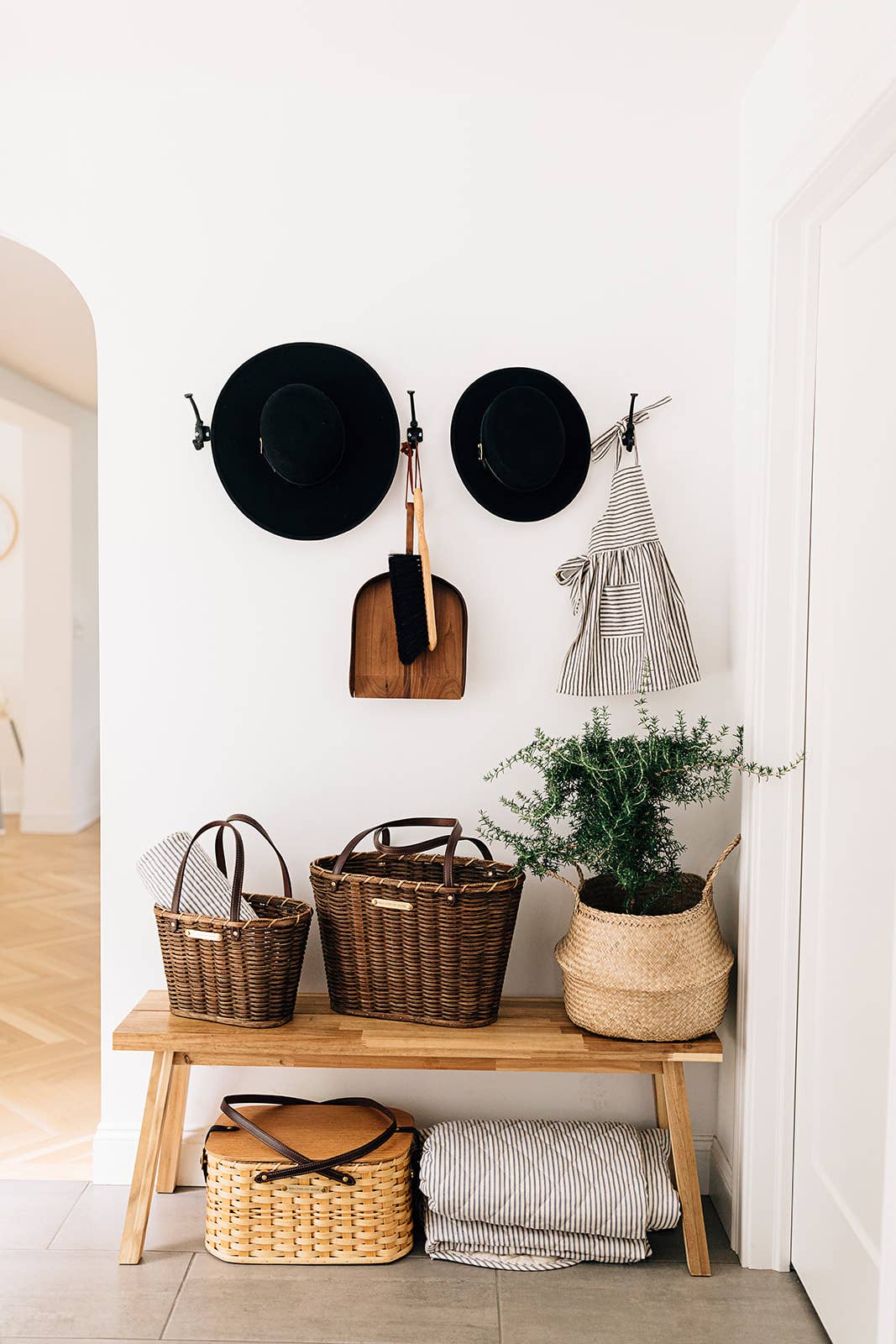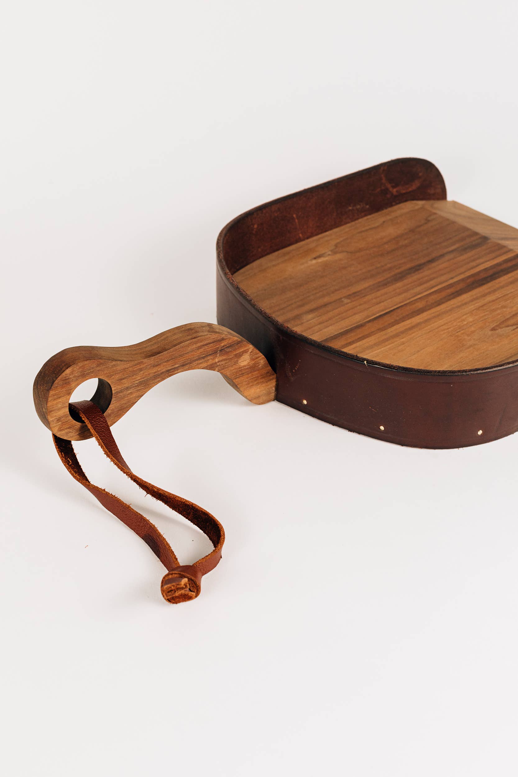 Meticulously handcrafted by our Amish neighbor, this masterpiece is created using locally sourced English walnut, wrapped in thick saddle leather, and fastened with individual brass tacks. Our maker takes great pride in ensuring that every detail is perfection, so you’re able to display and use this piece for generations.