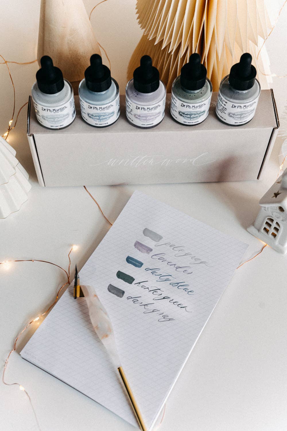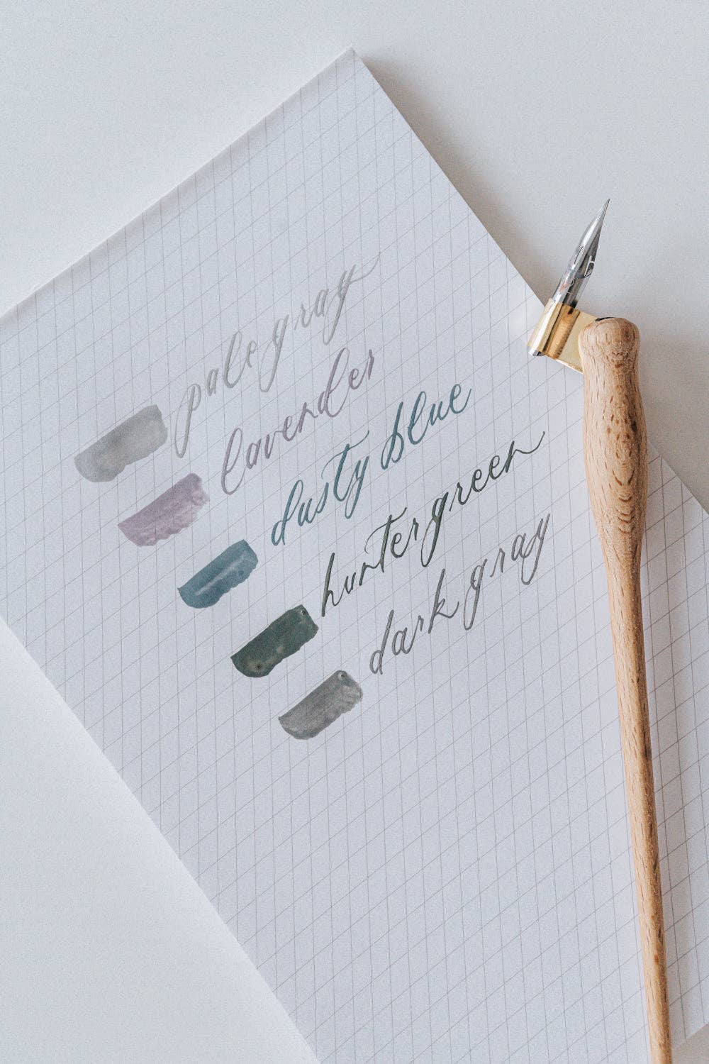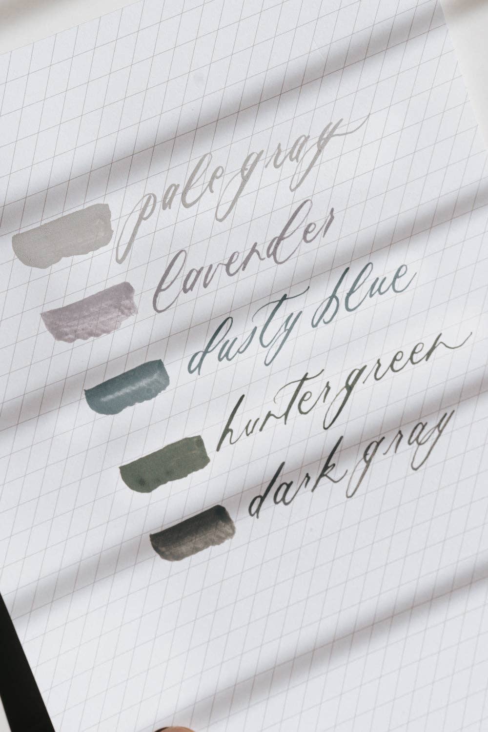 As a wedding calligrapher, my clients often ask me to create muted colored inks like taupe, blush, gray – but no ink from the bottle came just like this! So, we worked with Dr. Ph Martin’s to create an exclusive line of muted colored calligraphy inks, in warm tones and cool tones. I wanted to share my love for understated colors and can’t wait to see what you create with these inks.