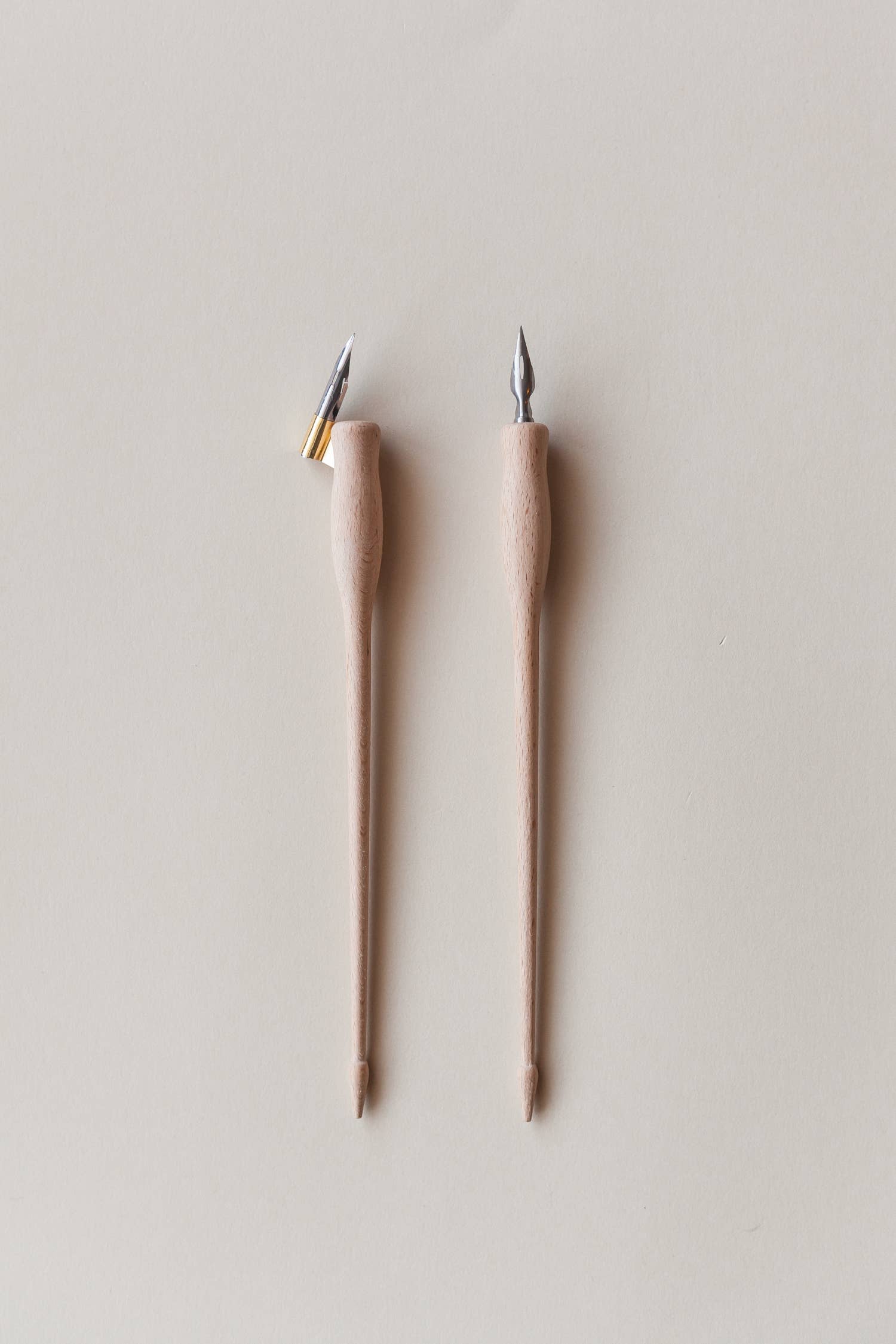 Hand-turned solid maple convertible oblique pen with brass flange and a tapered end. Ergonomic shape for comfort. Removable brass flange for easy conversion to straight pen. Fits a Nikko G and other similar sized nibs. Nibs are not included.