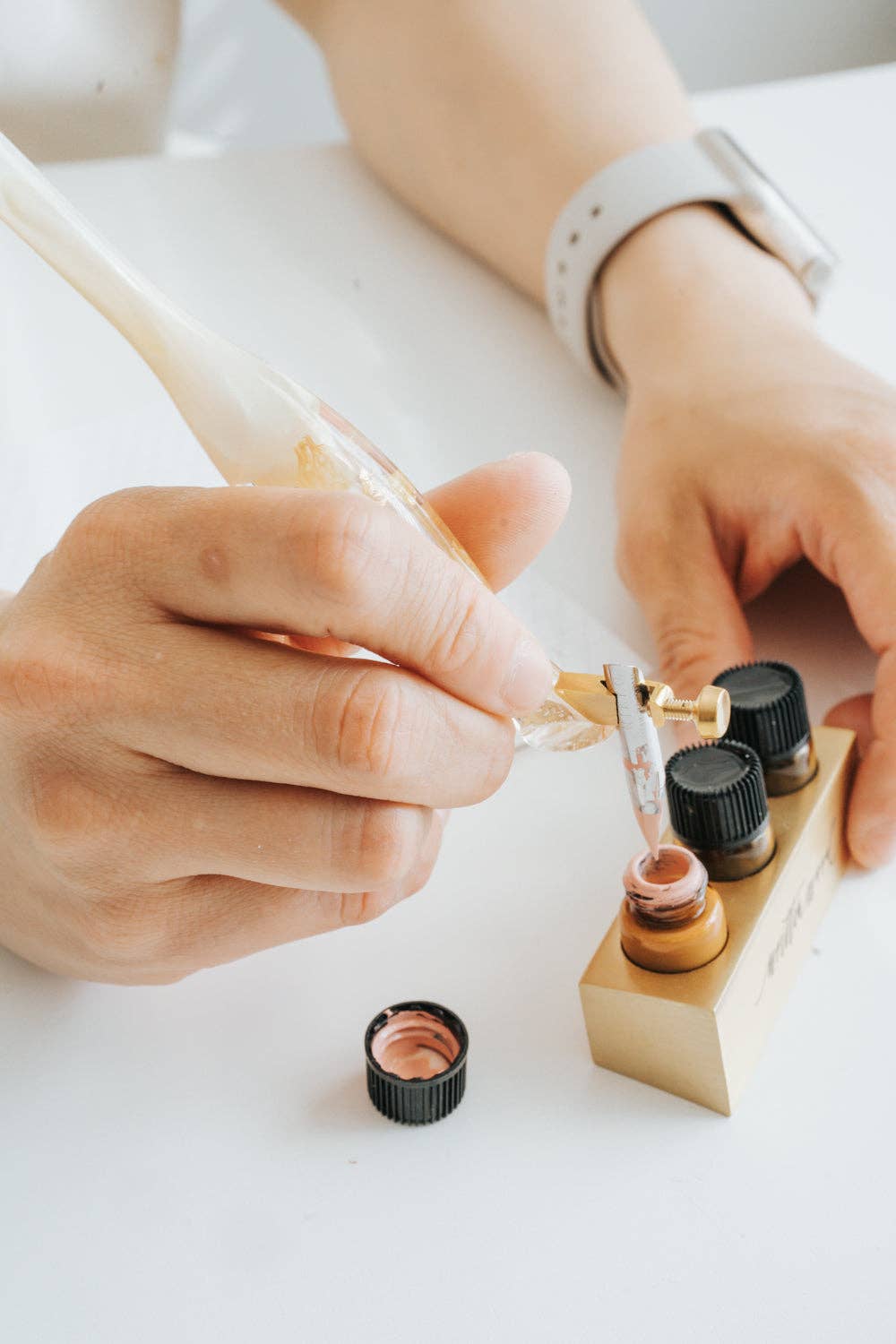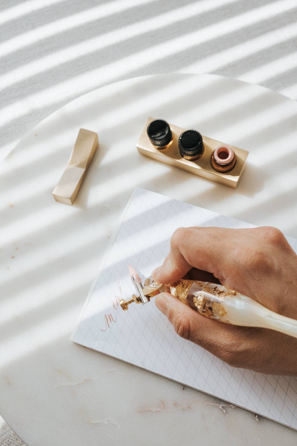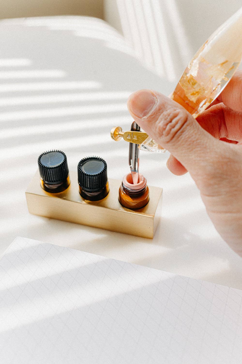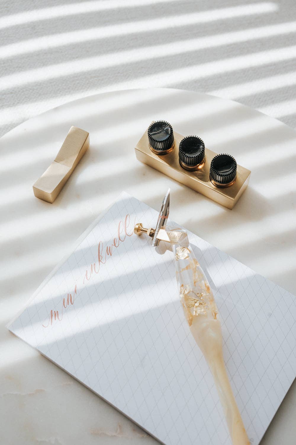 This mini inkwell is made with 100% brass, and holds 3 2ml bottles with stoppers.