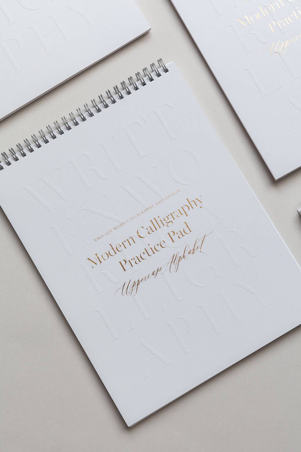 A 60-paged practice pad for learning and developing your own modern calligraphy style. This practice pad covers the basic tools and how-to’s, uppercase alphabet, numerals, connecting letters into words, and words into phrases.