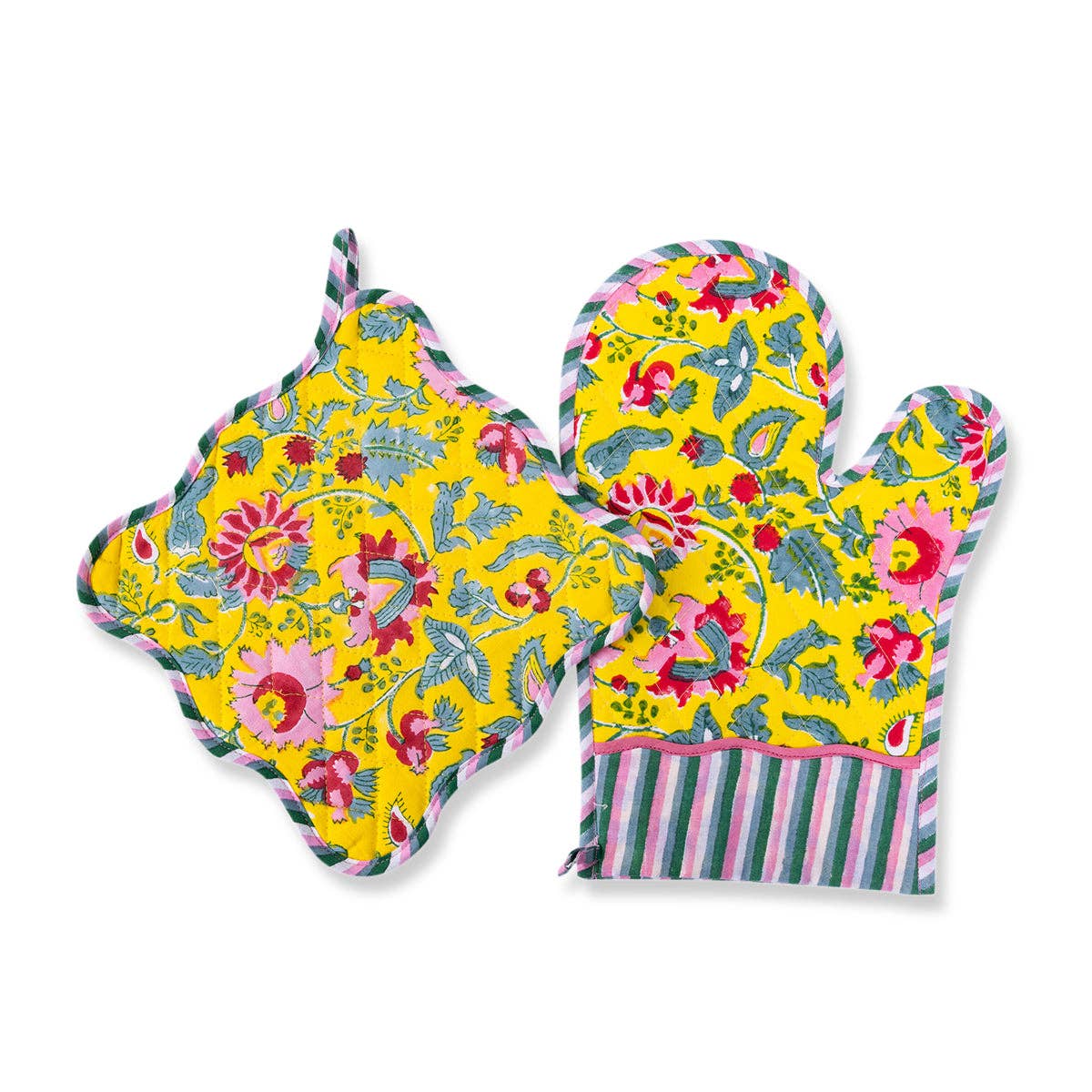 Chic and timeless, this pretty blockprint pot holder elevates the everyday and adds a colorful charm to your kitchen. Handmade in India, the charming color combo and the striped trim make a bold statement. By opting for sustainable table linens over disposable, we can help cut down on waste and support an age-old craft by artisans in Jaipur.