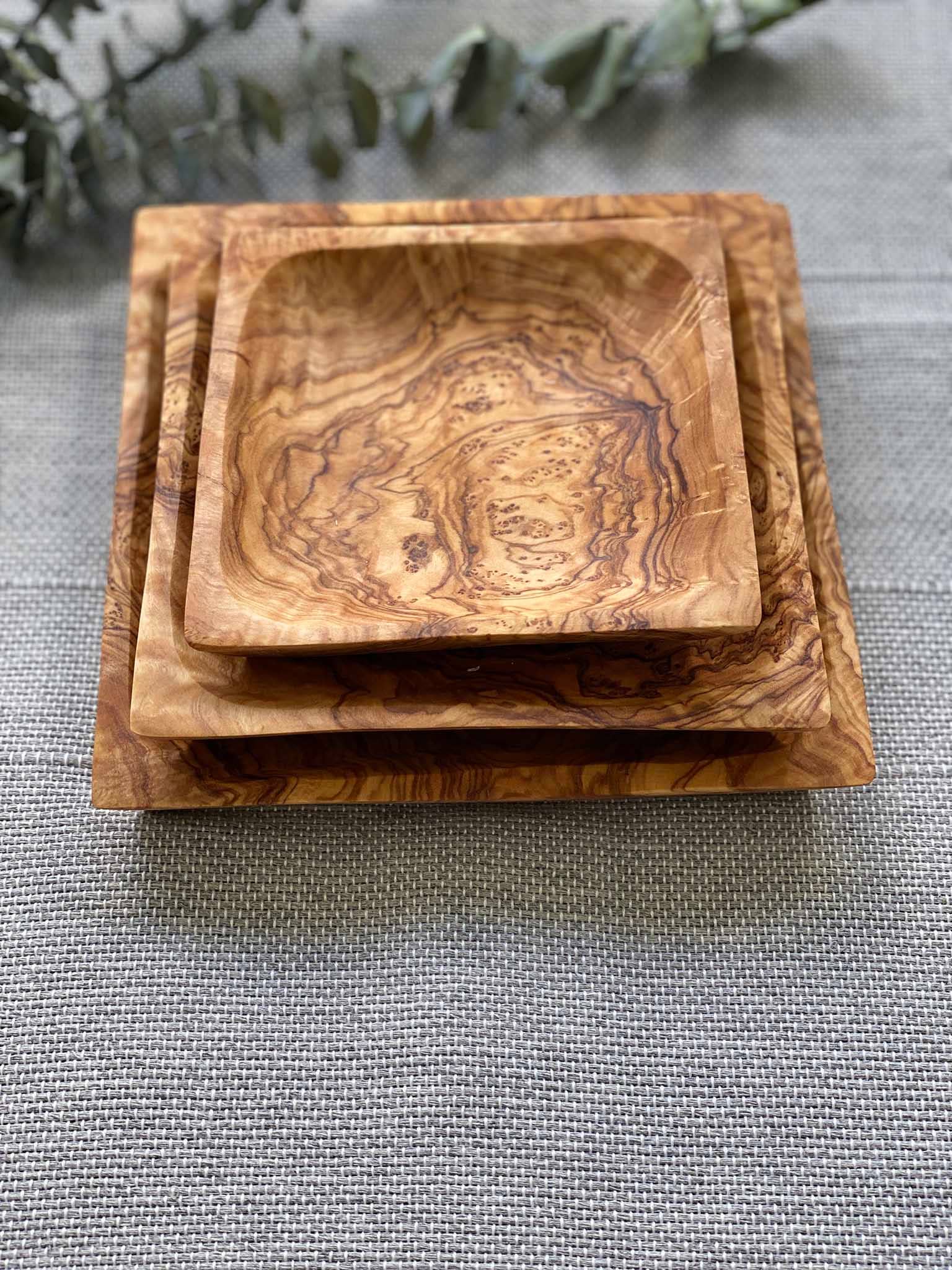 Enjoy the diversity of this set of 3 different size olive wood square dishes. Perfect to serve nuts, almond, olive and any appetizer salad. It can also be used as an elegant soap dish.