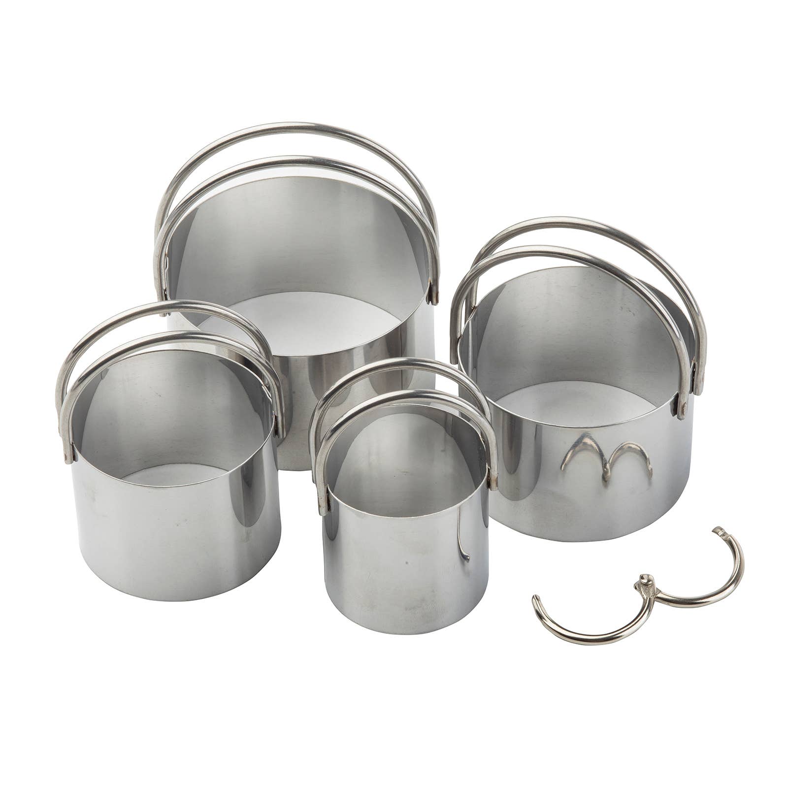A set of four cutters made of durable stainless steel. The smooth edges are ideal for making a variety of cookies, biscuits, mini-tarts and edible decorations. Set includes: 1½”, 2″, 2¼” & 2¾” cutter and nest together for compact storage.