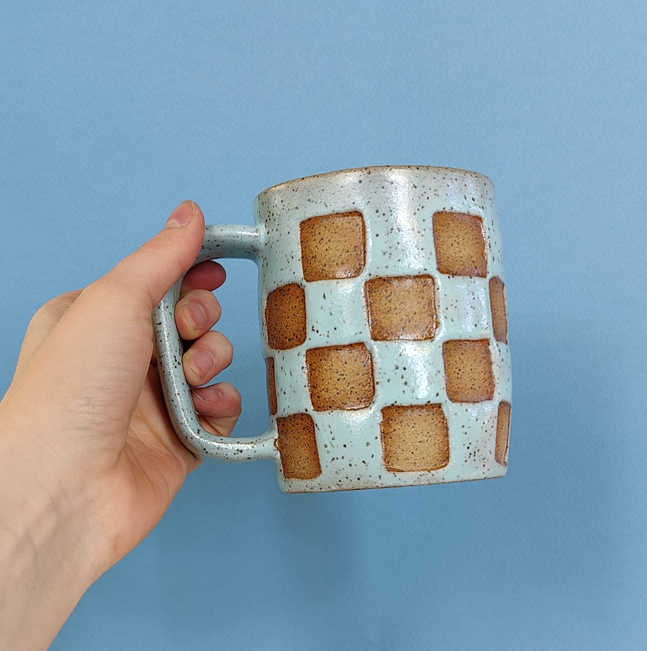 This is a variation on my classic black checker mug, but this time in a robin’s egg blue! The glaze is glossy and shows off the speckles in the clay. Just a lighter take on a classic check design. Thrown on the wheel and stamped.