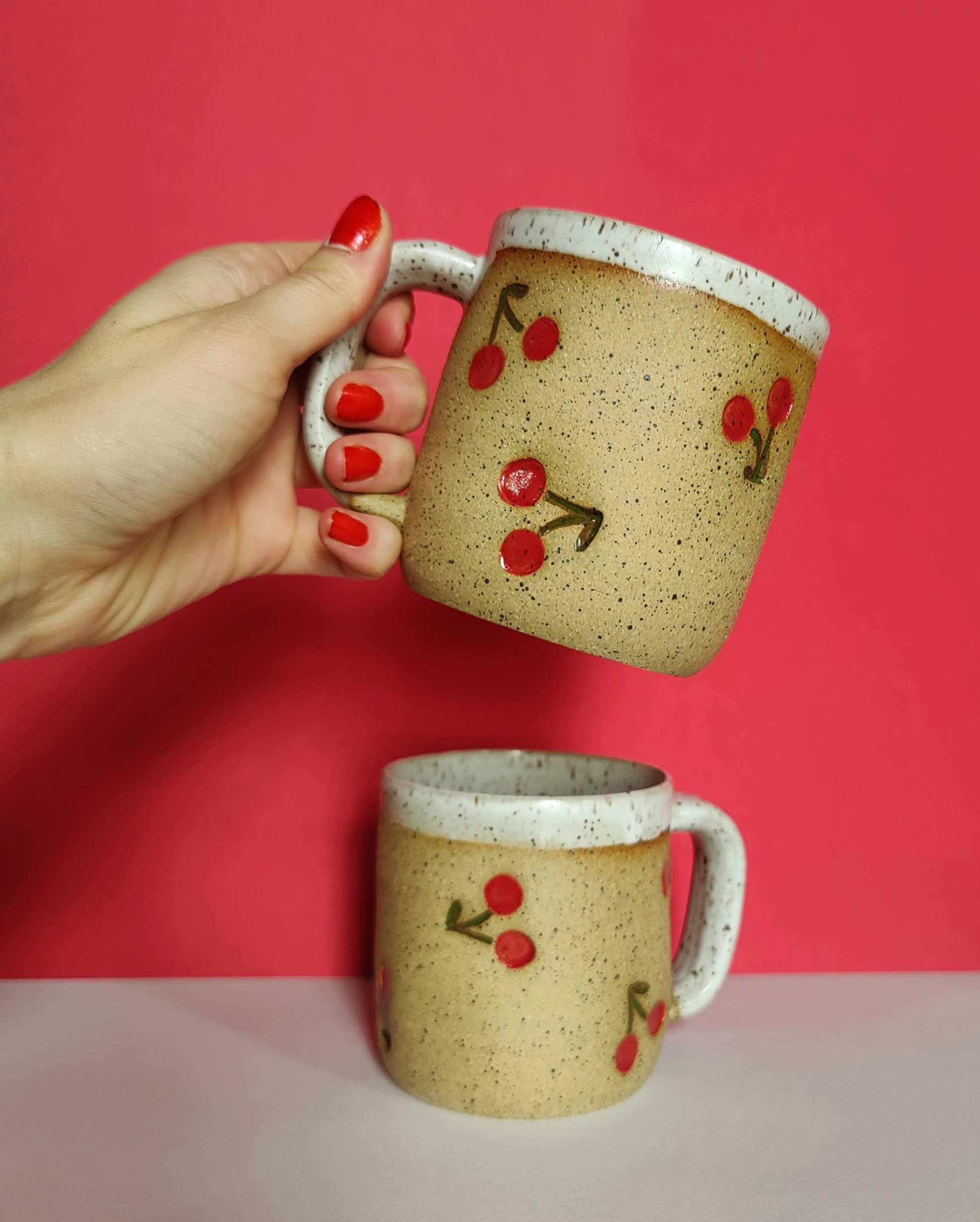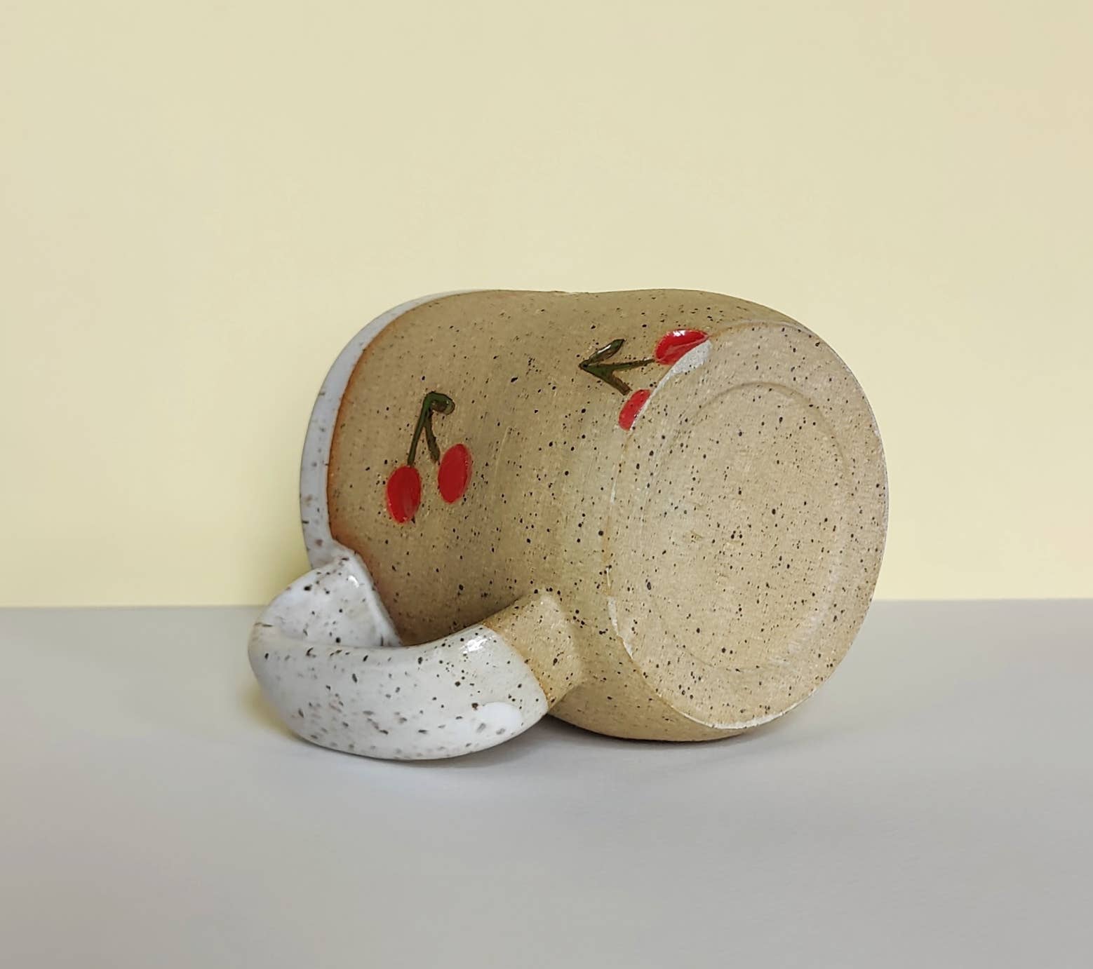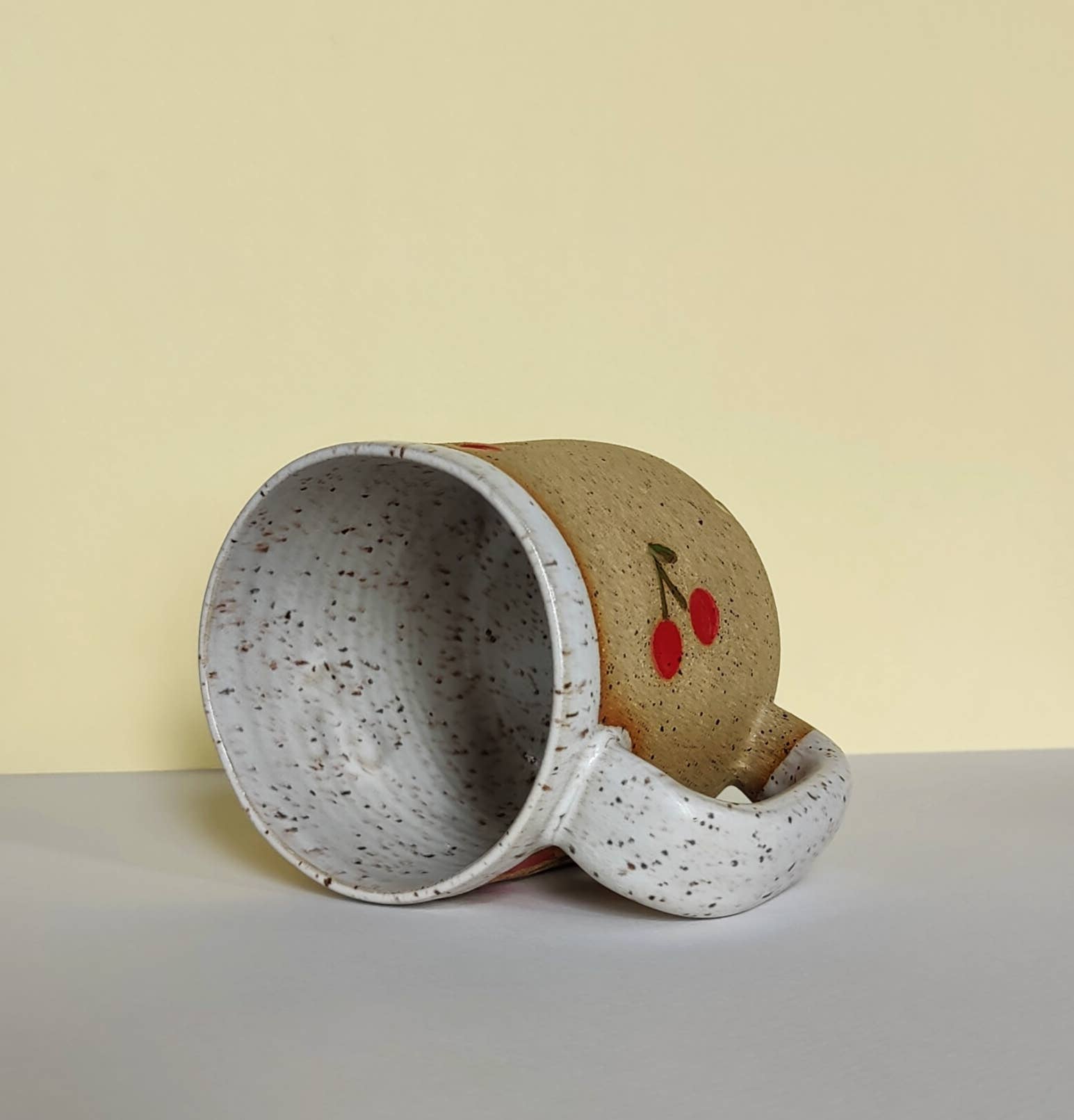 This handmade mug was thrown on the wheel and then stamped with my hand carved cherry stamp! The interior, lip, and handle are glazed a satin white that shows off the speckles of the clay. The rest of the body is the natural brown of the clay with the glossy glazed cherry details.