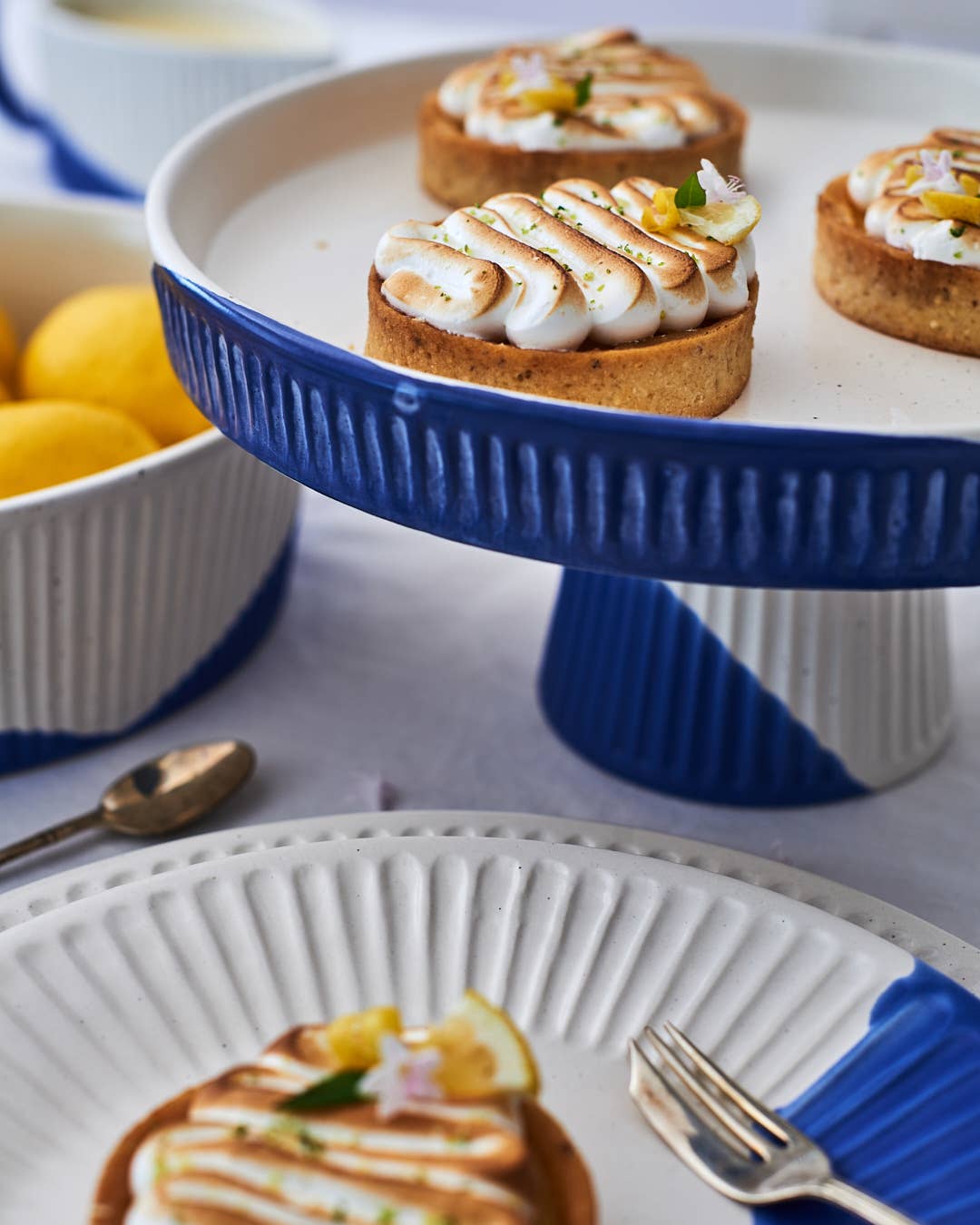 Hand-painted ceramic cake stand with a touch of blue, that will make your cake POP.