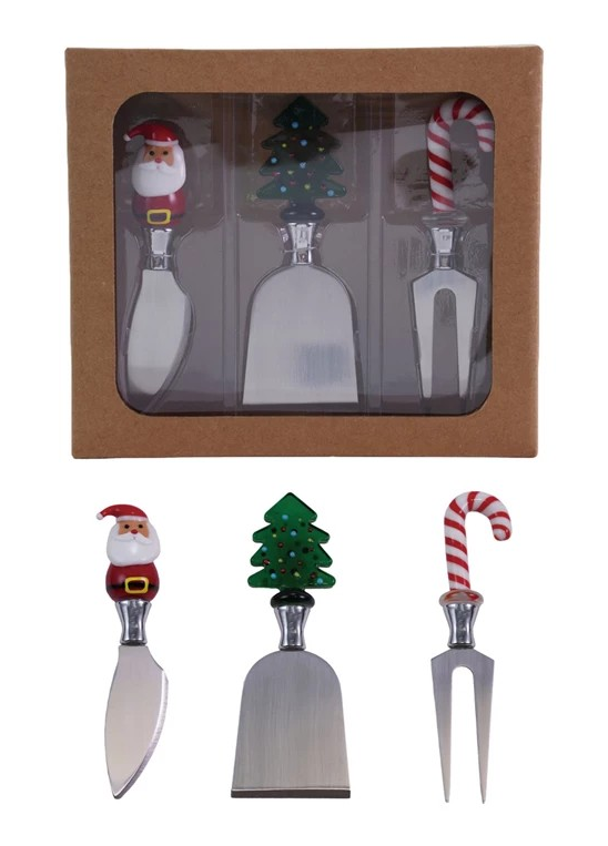 This boxed set of three cheese knives features hand-blown glass handles with festive holiday icons, combining unique design with functionality. Crafted from high-quality materials, they make an excellent addition to your holiday gatherings or a thoughtful gift.