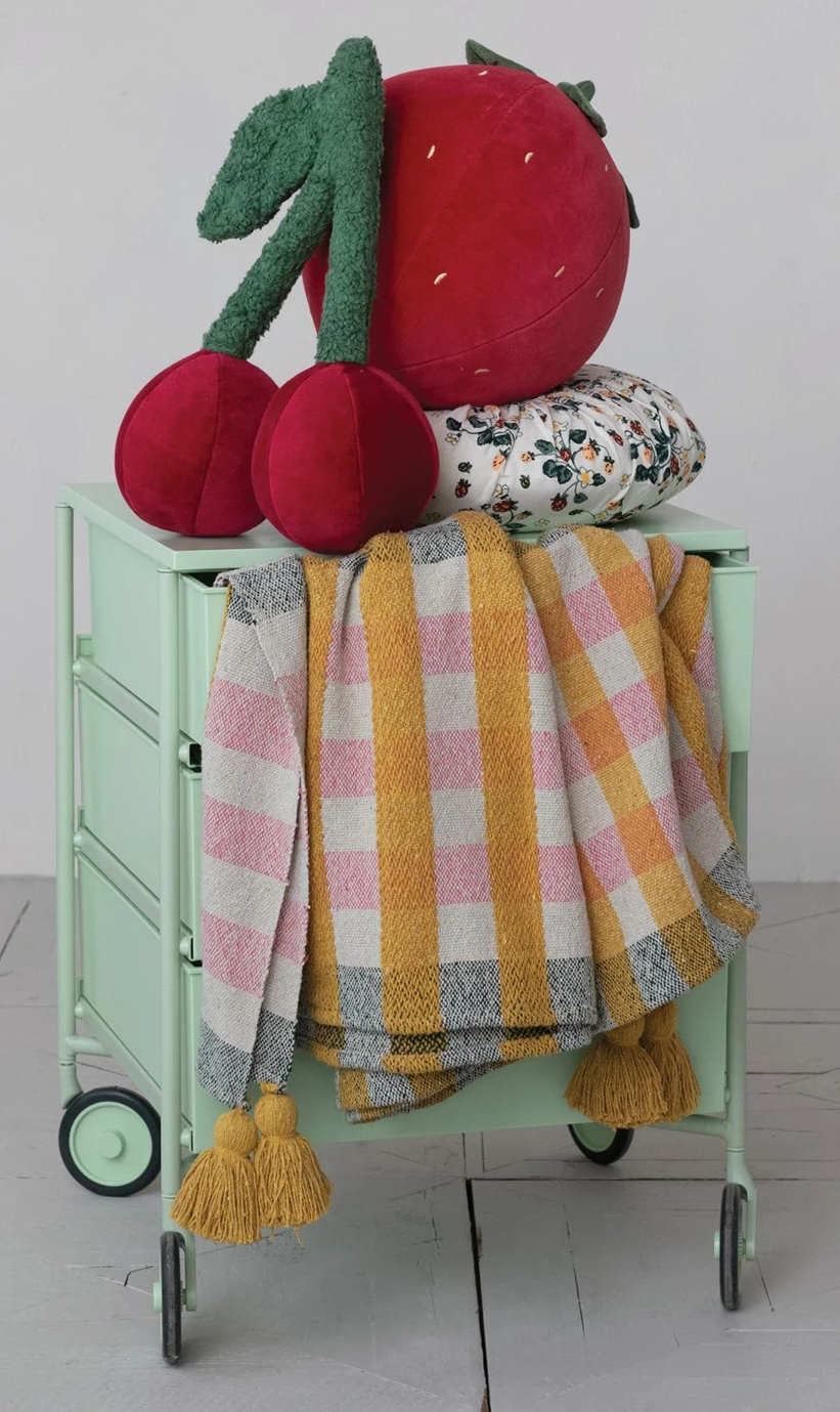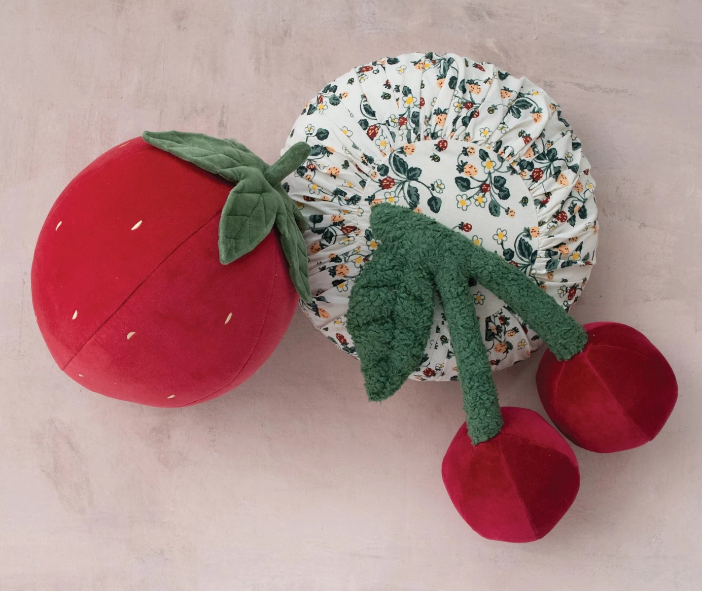 Add a playful touch to your decor with this Cotton Velvet Cherry Shaped Pillow featuring a soft velvet body in red and a cozy faux sherpa stem in green. Measuring 16″L x 12″W, its whimsical design and plush materials make it both stylish and comfortable.