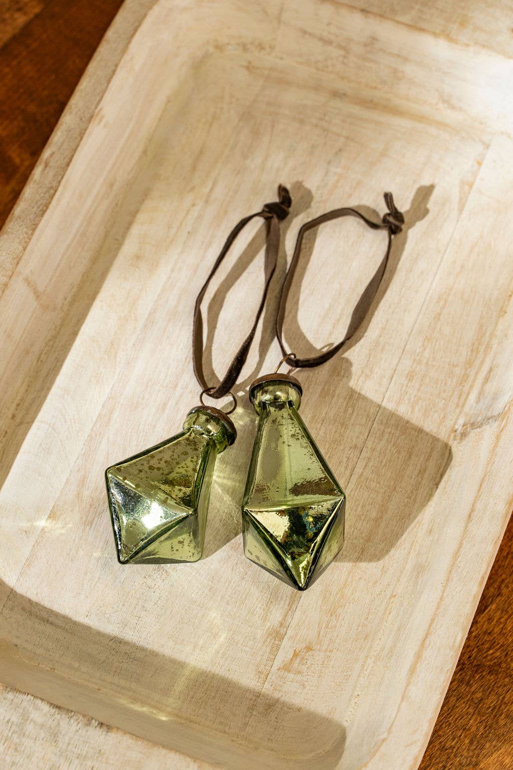 Materials & Composition: Made from recycled glass in a faceted diamond shape with a deep jade finish, complete with a velvet loop for a soft, elegant touch and easy hanging.