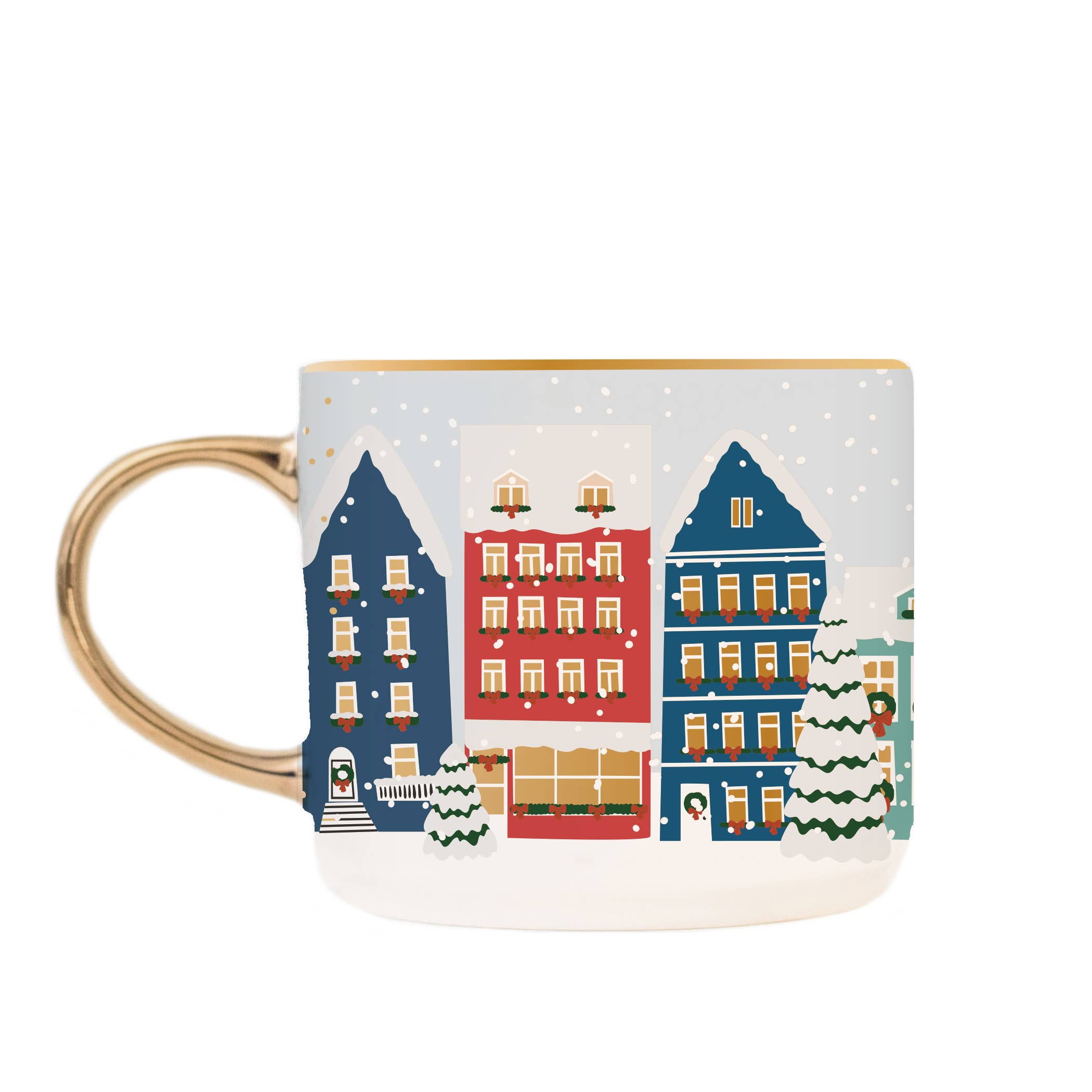 Make your shop festive with our Christmas Village holiday mug! Perfect for holiday gifting and holiday decorations, this mug will be a customer go-to for their favorite winter drinks. Real gold accents throughout the design and on the handle instantly brighten each sip.