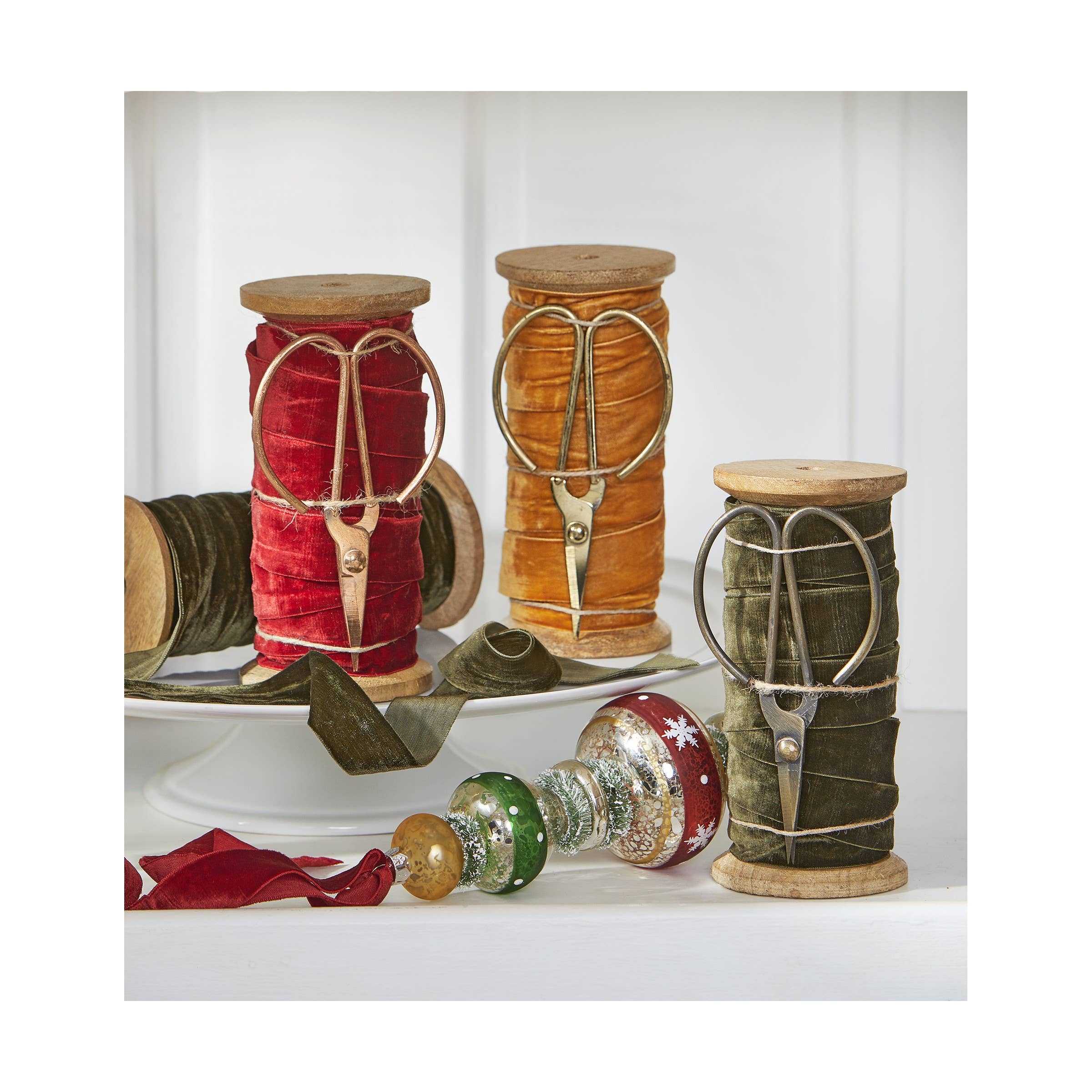 Artisan-crafted ribbons are the perfect accessory for the season! Elevate gift wrapping, hang ornaments in style, accessorize wreaths and flower bouquets, or use as an accent to any decor project for the home. Wrapped around a mango wood spool and held by an antique pin. Includes beautiful scissors to use for cutting the ribbon.