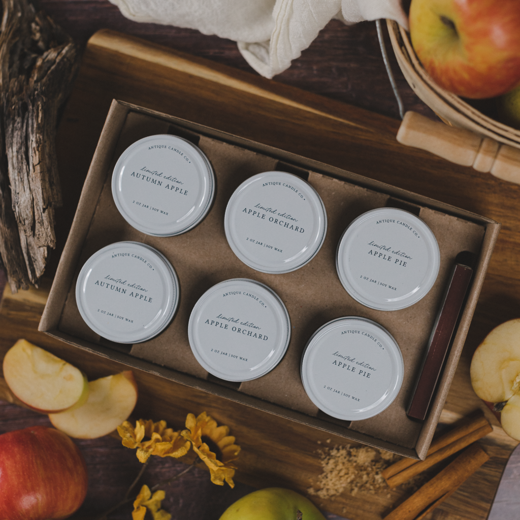 The Apple Grove Sample Pack includes two of each Limited Edition Apple fragrance in 2 oz Mason Jar candles and a matchbox.