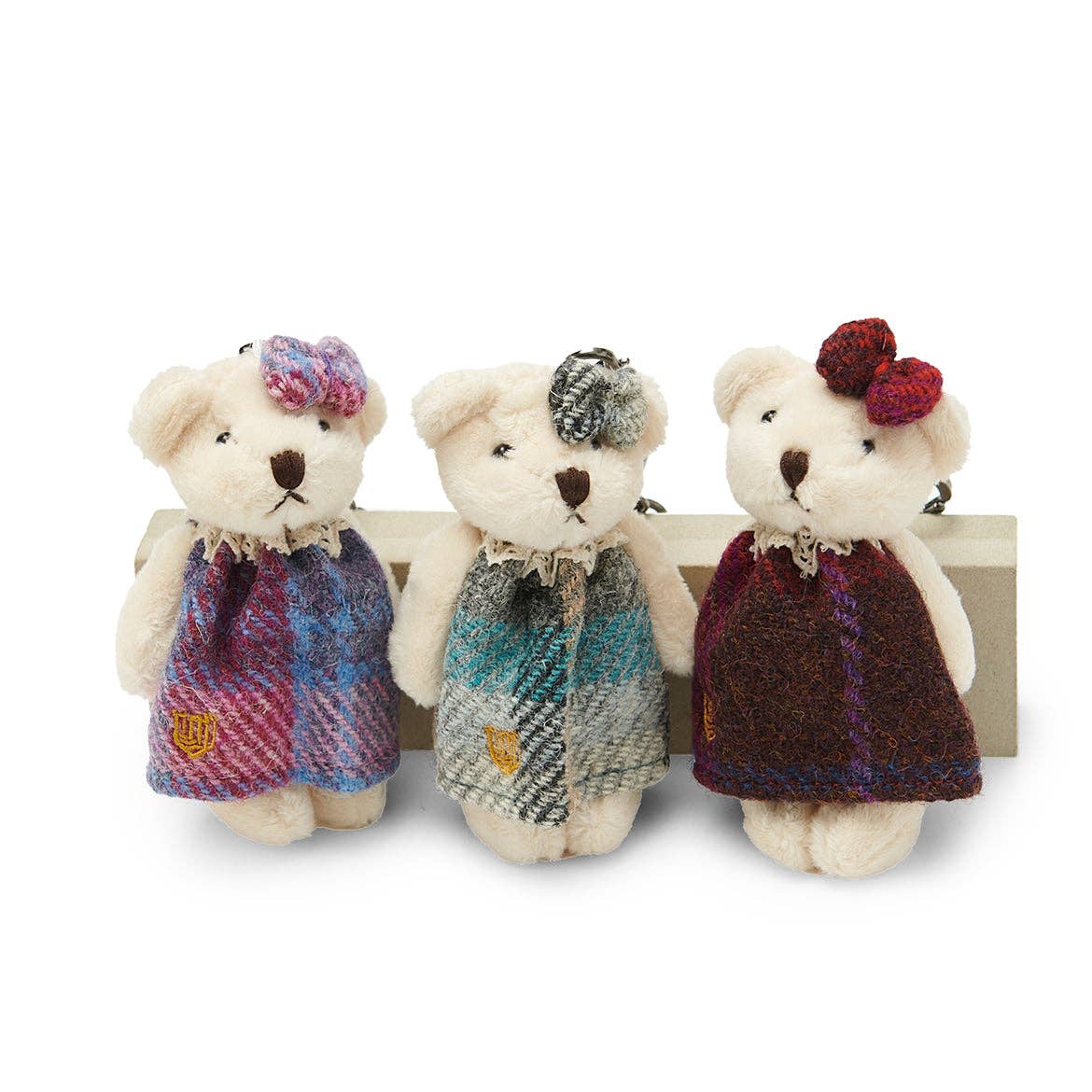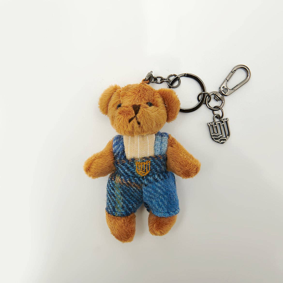 Soft bear keyring with tartan dungarees