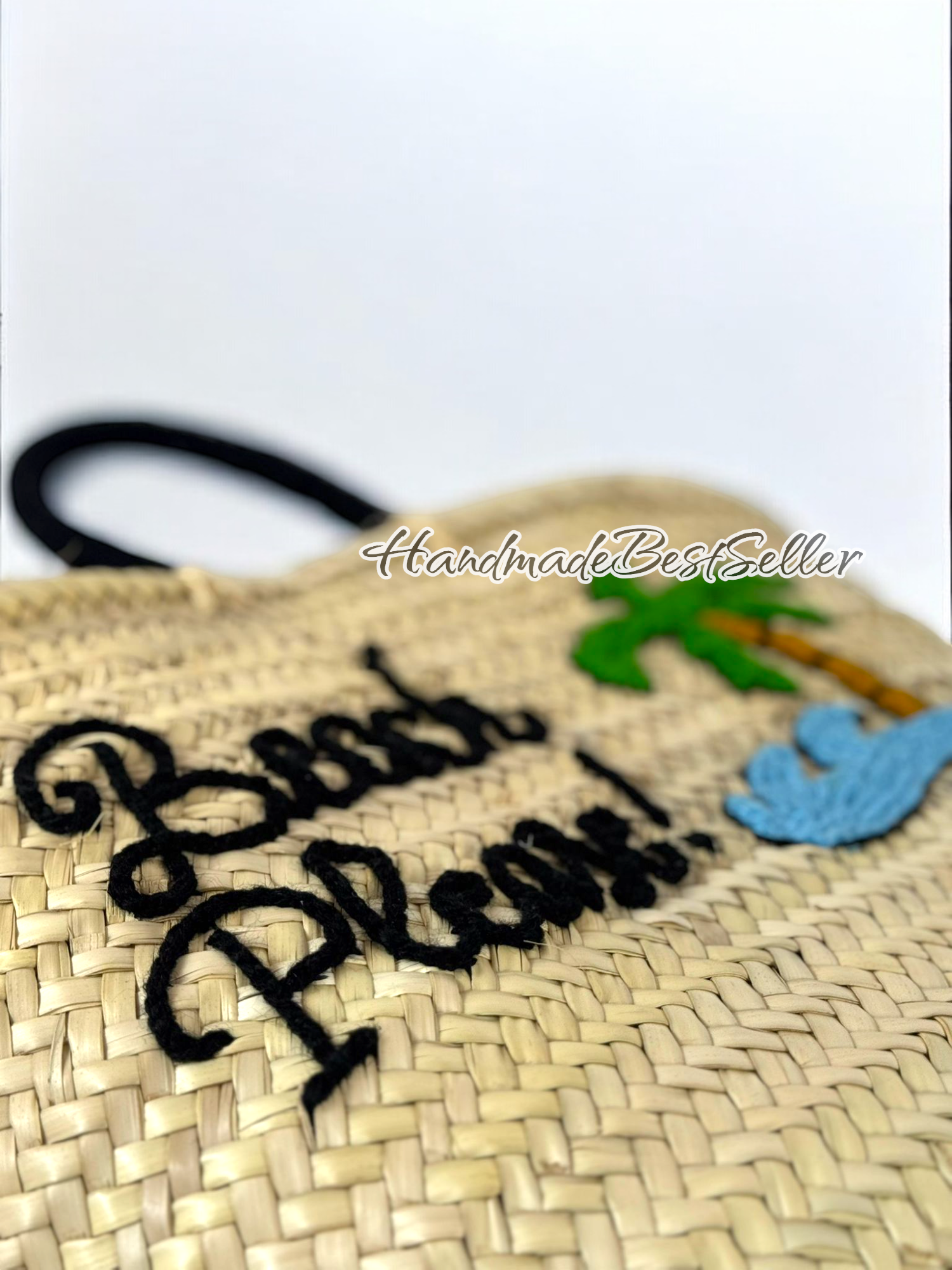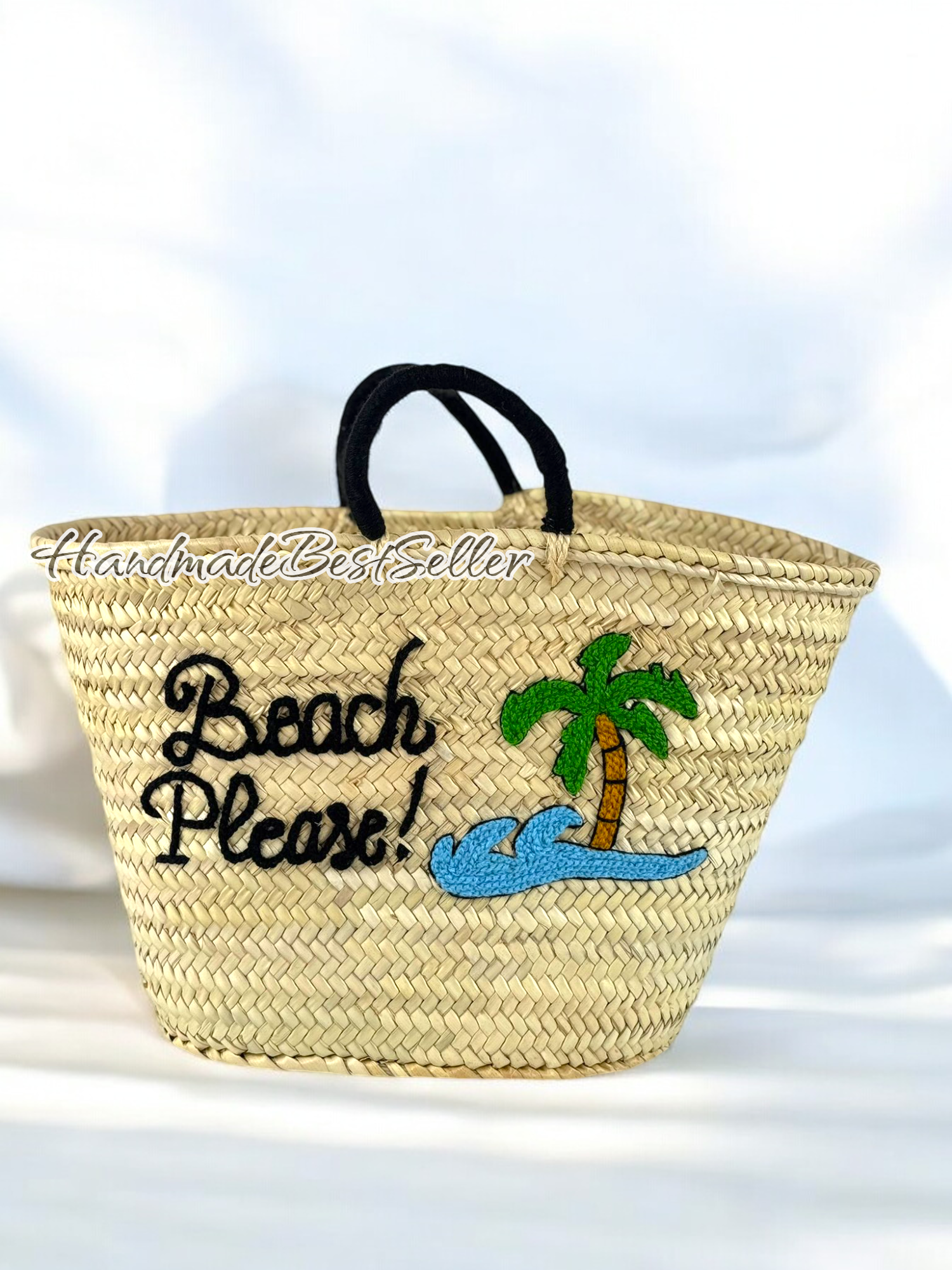 This spacious handwoven straw beach bag features cheerful “Beach Please!” text alongside a colorful palm tree embroidery, making it perfect for summer adventures. Measuring 50 cm (20 in) in length and 30 cm (12 in) in height, it provides ample room for all your beach essentials. Crafted by Moroccan artisans, this eco-friendly and durable bag blends practicality with style.