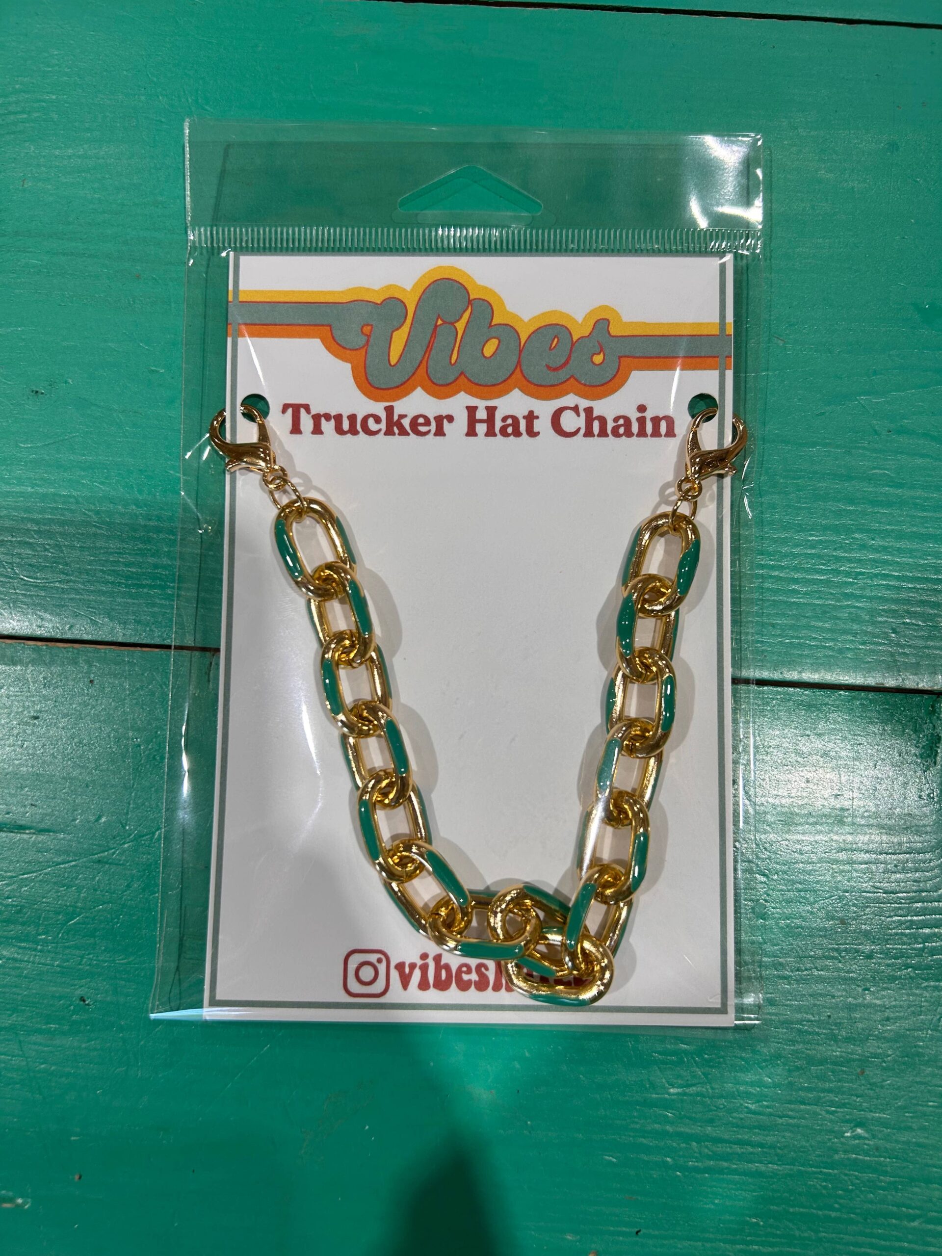 This trucker chain is one of our new & limited edition trucker hat chains. This chain is a chunky gold chain enamel dipped with teak. All Vibes Hat Co trucker hat chains have lobster claw clasps on either end so they can be easily moved from cap to cap.