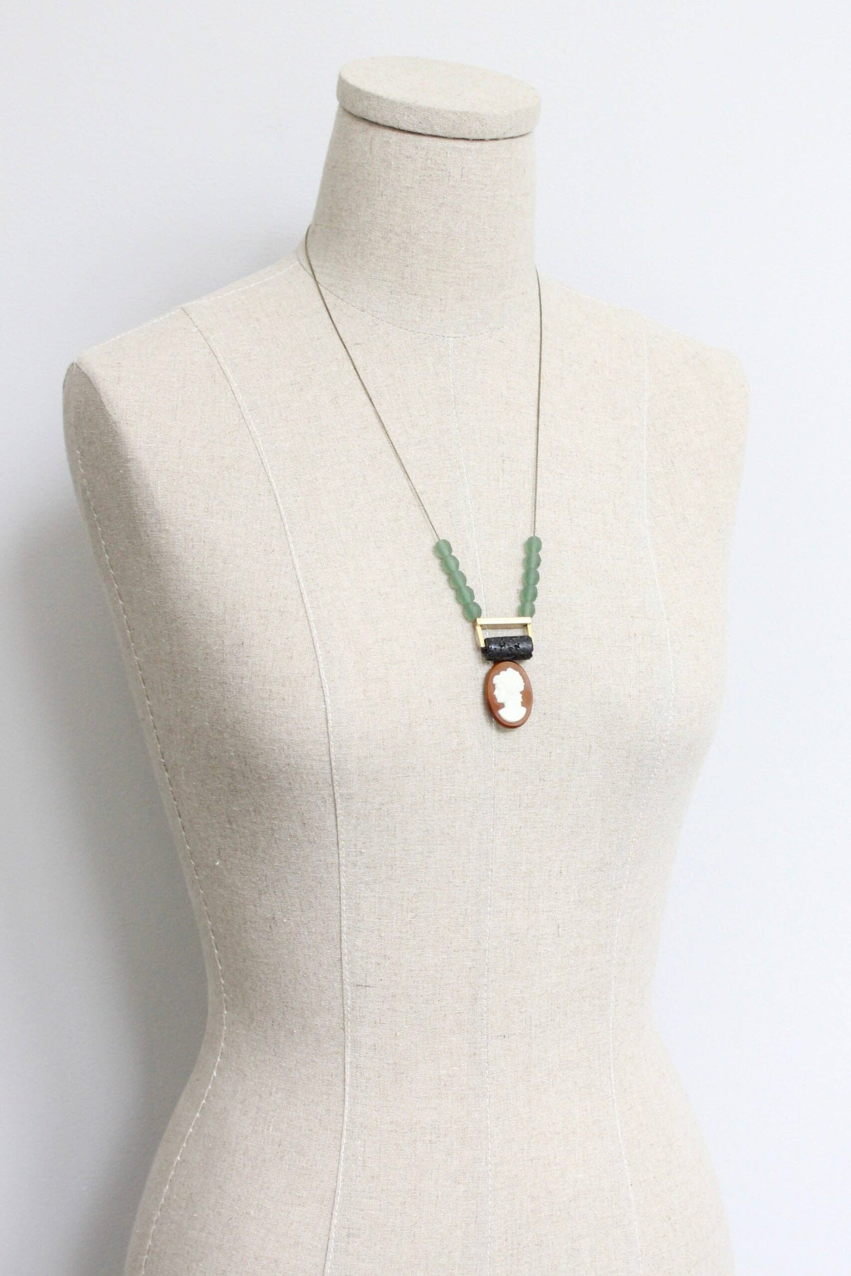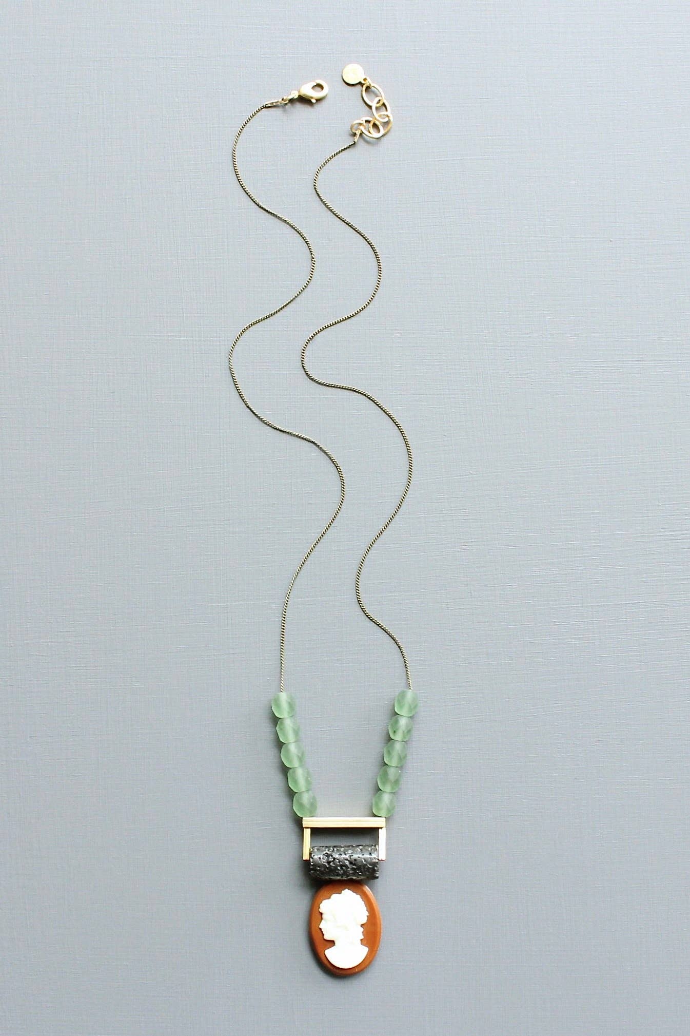 23” necklace with oxidized brass chain, vintage glass cameo, and lava bead pendant. 1 inch extender.