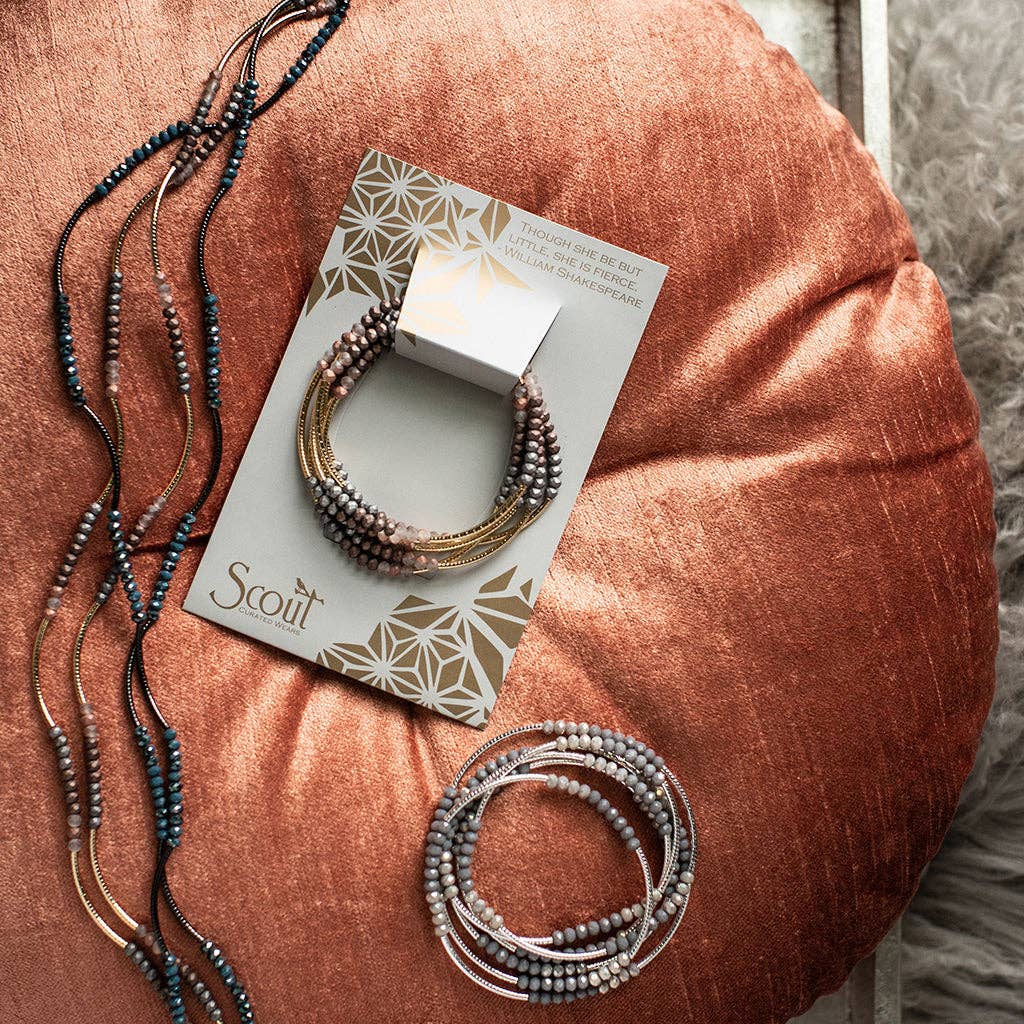 The Scout Wrap is made with crystal beads and etched metal findings. It can be worn wrapped 6-7 times for a bracelet and 1-3 times for a necklace. Displayed on beautiful cards and personalized with inspiring quotes they make a great gift!