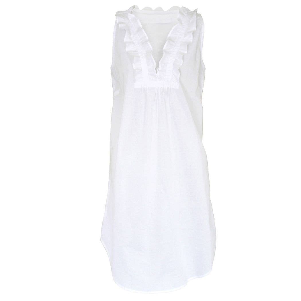 Sleeveless nightgown made of soft, lightweight 100% cotton cambric. Simple ruffles along the v-neck. Machine wash warm, tumble dry low.